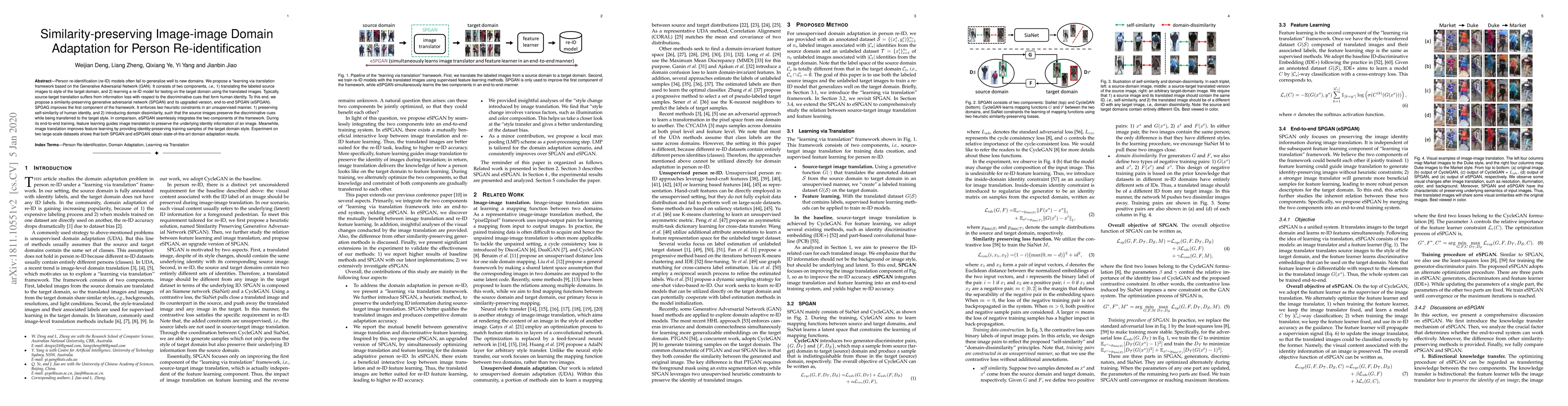 This paper proposes similarity-preserving generative adversarial networks (SPGAN and eSPGAN) for unsupervised domain adaptation in person re-identification, achieving state-of-the-art results by preserving human identity information during image translation and integrating re-ID model learning.