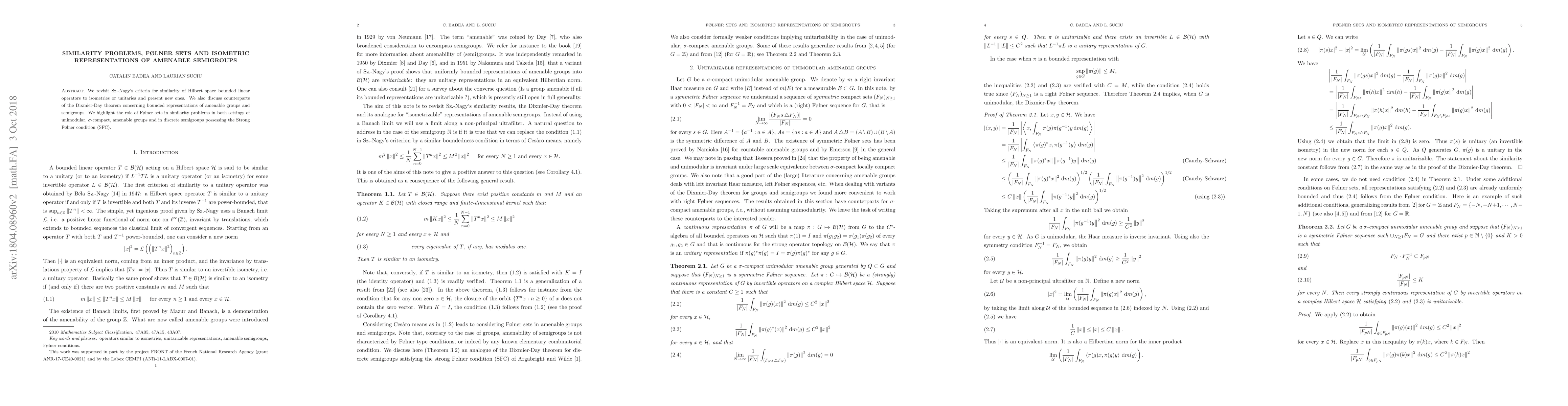 This paper revisits Sz.-Nagy's criteria for the similarity of Hilbert space operators to isometries, introducing new criteria, and extends Dixmier-Day theorem results for amenable groups to semigroups. It emphasizes the role of Folner sets in similarity problems for both unimodular, $\sigma$-compact, amenable groups and discrete semigroups with the Strong Folner condition.