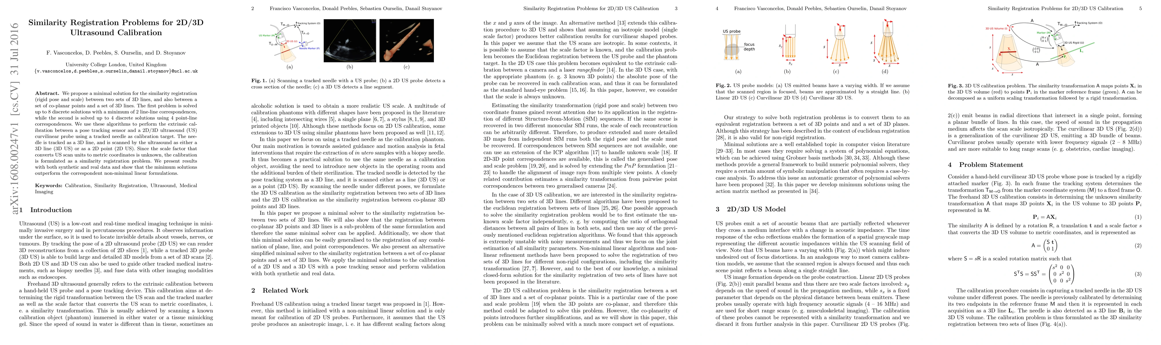 This paper proposes minimal algorithms for similarity registration between 3D lines and co-planar points, solving up to 8 and 4 discrete solutions respectively, and applies these to calibrate 2D/3D ultrasound probes using tracked needles, demonstrating superior performance over non-minimal methods.