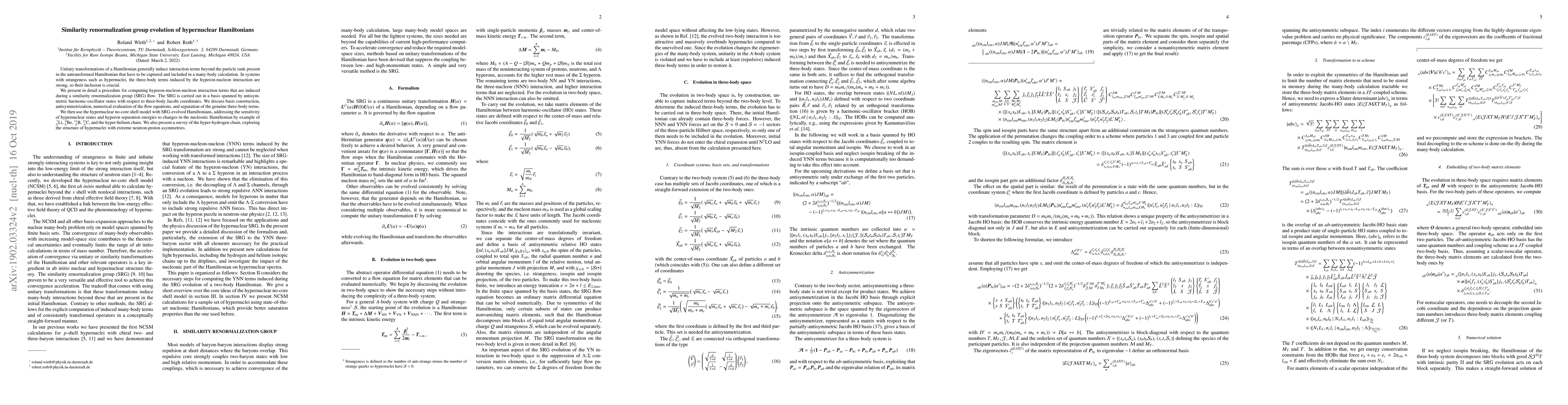 Unitary transformations of a Hamiltonian generally induce interaction terms beyond the particle rank present in the untransformed Hamiltonian that have to be captured and included in a many-body calculation. In systems with strangeness such as hypernuclei, the three-body terms induced by the hyperon-nucleon interaction are strong, so their inclusion is crucial. We present in detail a procedure for computing hyperon-nucleon-nucleon interaction terms that are induced during a similarity renormalization group (SRG) flow. The SRG is carried out in a basis spanned by antisymmetric harmonic-oscillator states with respect to three-body Jacobi coordinates. We discuss basis construction, antisymmetrization, numerical evaluation of the flow equations, and separation of the genuine three-body terms. We then use the hypernuclear no-core shell model with SRG-evolved Hamiltonians, addressing the sensitivity of hypernuclear states and hyperon separation energies to changes in the nucleonic Hamiltonian by example of $^7_\Lambda$Li, $^9_\Lambda$Be, $^{11}_\Lambda$B, $^{13}_\Lambda$C, and the hyper-helium chain. We also present a survey of the hyper-hydrogen chain, exploring the structure of hypernuclei with extreme neutron-proton asymmetries.