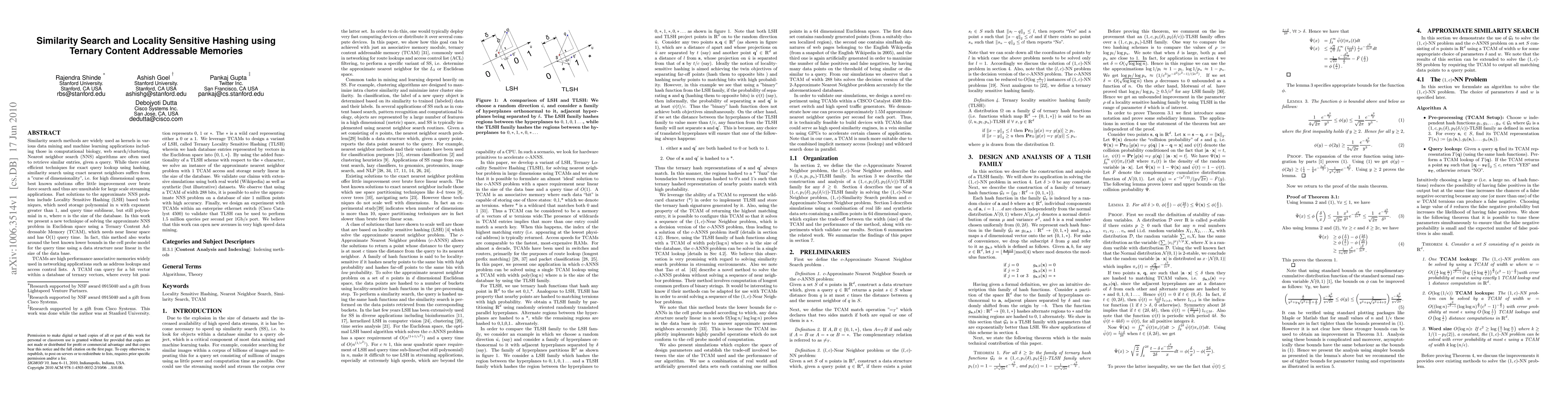 Similarity search methods are widely used as kernels in various machine learning applications. Nearest neighbor search (NNS) algorithms are often used to retrieve similar entries, given a query. While there exist efficient techniques for exact query lookup using hashing, similarity search using exact nearest neighbors is known to be a hard problem and in high dimensions, best known solutions offer little improvement over a linear scan. Fast solutions to the approximate NNS problem include Locality Sensitive Hashing (LSH) based techniques, which need storage polynomial in $n$ with exponent greater than $1$, and query time sublinear, but still polynomial in $n$, where $n$ is the size of the database. In this work we present a new technique of solving the approximate NNS problem in Euclidean space using a Ternary Content Addressable Memory (TCAM), which needs near linear space and has O(1) query time. In fact, this method also works around the best known lower bounds in the cell probe model for the query time using a data structure near linear in the size of the data base. TCAMs are high performance associative memories widely used in networking applications such as access control lists. A TCAM can query for a bit vector within a database of ternary vectors, where every bit position represents $0$, $1$ or $*$. The $*$ is a wild card representing either a $0$ or a $1$. We leverage TCAMs to design a variant of LSH, called Ternary Locality Sensitive Hashing (TLSH) wherein we hash database entries represented by vectors in the Euclidean space into $\{0,1,*\}$. By using the added functionality of a TLSH scheme with respect to the $*$ character, we solve an instance of the approximate nearest neighbor problem with 1 TCAM access and storage nearly linear in the size of the database. We believe that this work can open new avenues in very high speed data mining.