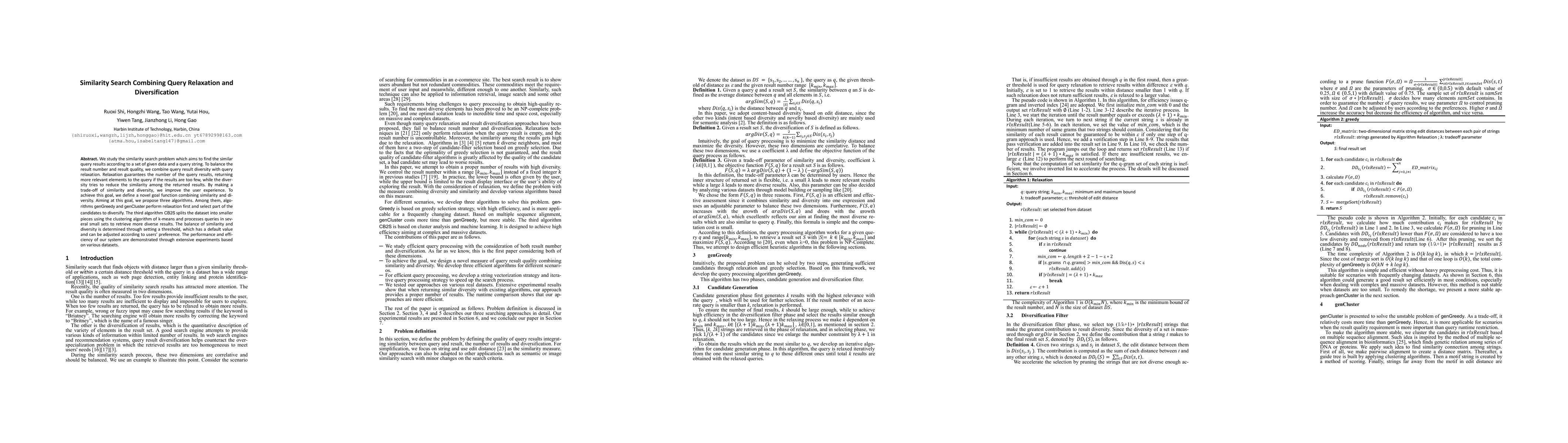 This paper proposes a similarity search method that combines query relaxation and diversification to balance result quantity and quality. It introduces a novel goal function and three algorithms to achieve this balance, demonstrating improved user experience through extensive experiments.