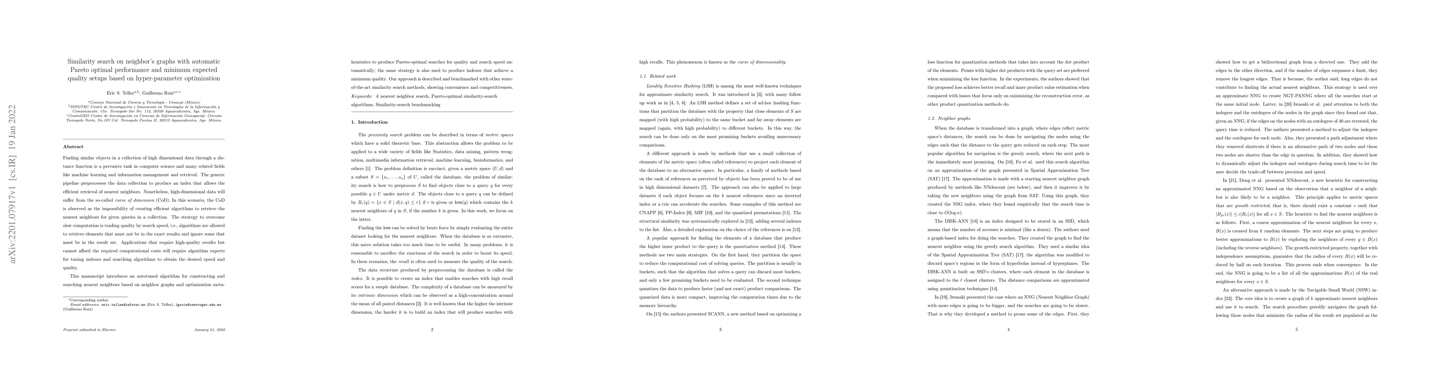 This manuscript introduces an autotuned algorithm for searching nearest neighbors based on neighbor graphs and optimization metaheuristics to produce Pareto-optimal searches for quality and search speed automatically; the same strategy is also used to produce indexes that achieve a minimum quality. Our approach is described and benchmarked with other state-of-the-art similarity search methods, showing convenience and competitiveness.