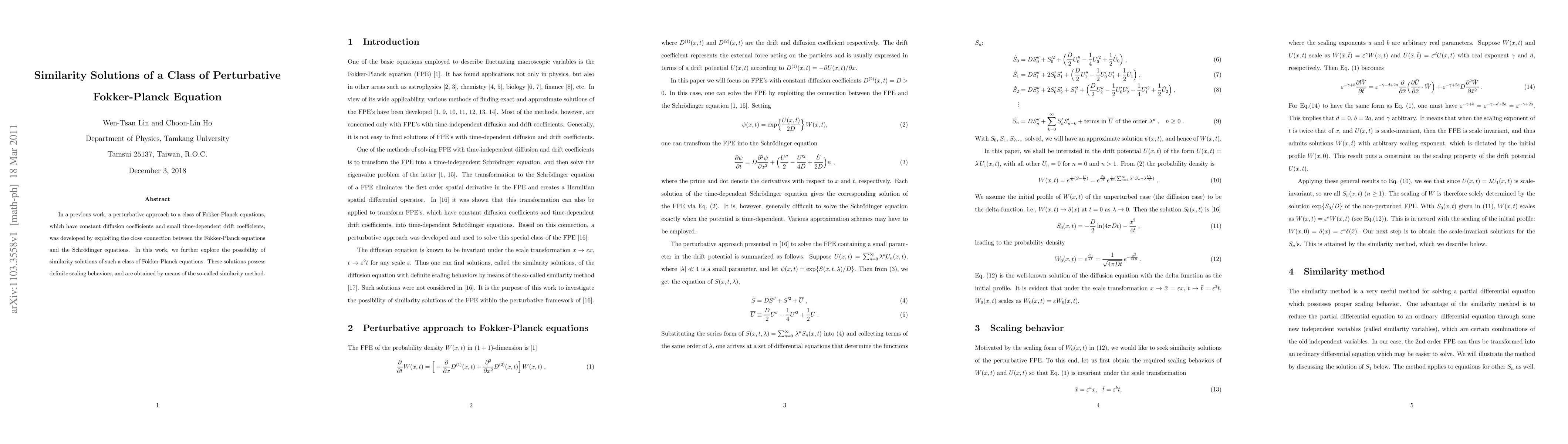 This paper investigates the similarity solutions of a class of perturbative Fokker-Planck equations with constant diffusion and small time-dependent drift coefficients, leveraging the similarity method to derive solutions with specific scaling behaviors.