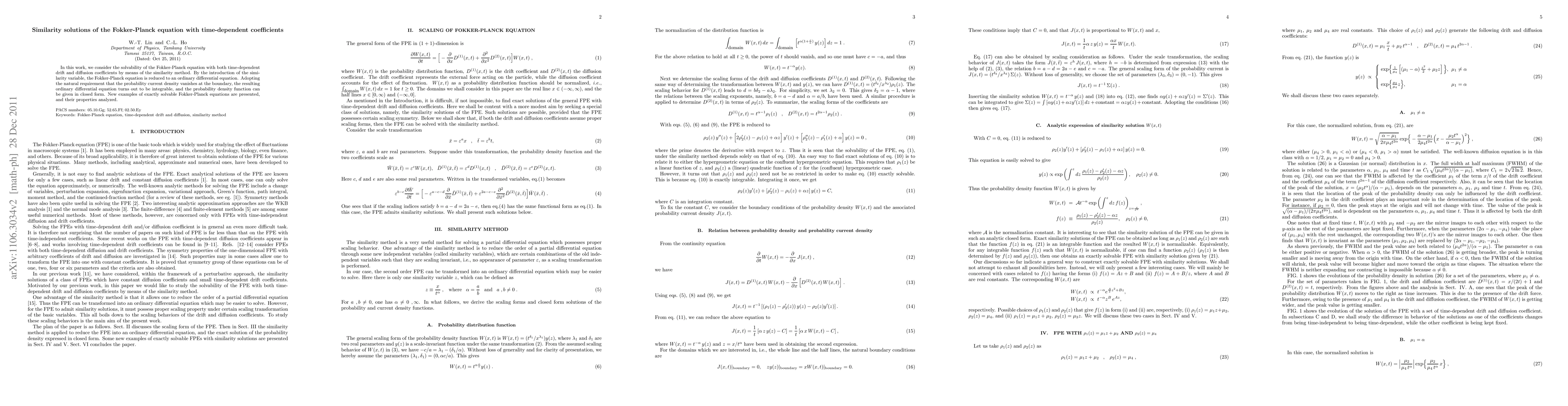 This paper explores the solvability of the Fokker-Planck equation with time-dependent drift and diffusion coefficients using the similarity method, reducing it to an integrable ordinary differential equation. The probability density function is derived in closed form, presenting new examples of exactly solvable cases and their properties.