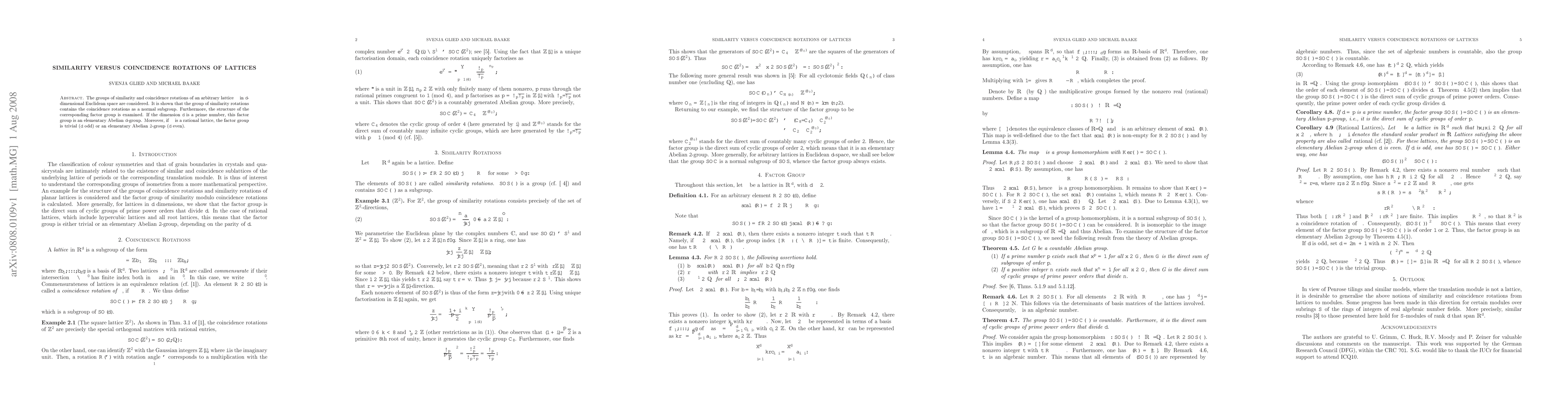 This paper explores the relationship between similarity and coincidence rotations of lattices in d-dimensional space, revealing that coincidence rotations form a normal subgroup within similarity rotations. The study shows the factor group's structure varies based on the dimension's primality, being an elementary Abelian d-group if d is prime, and trivial or an elementary Abelian 2-group if L is rational and d is even or odd, respectively.