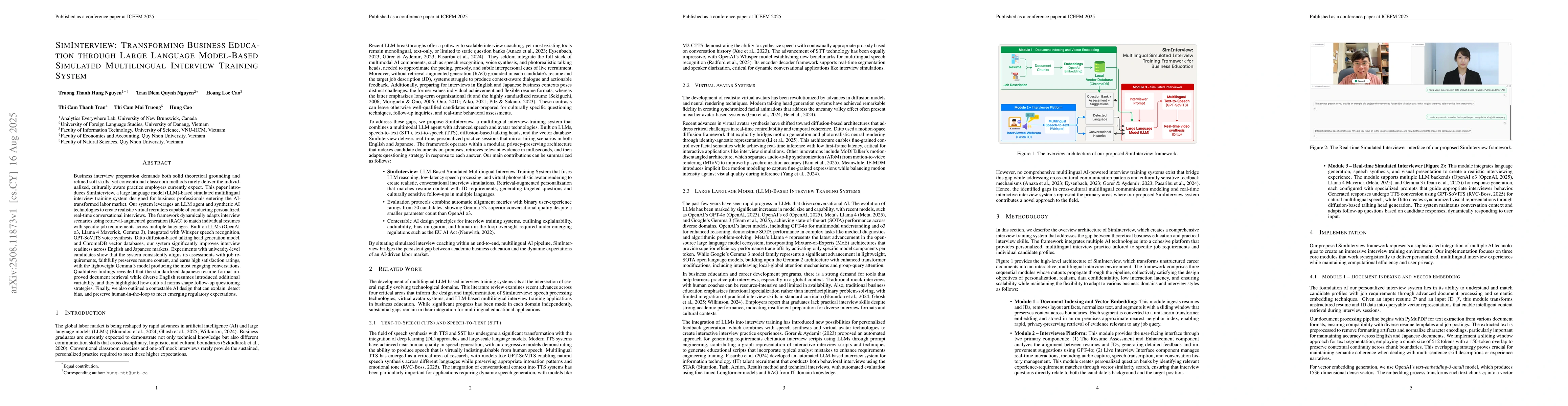 Business interview preparation demands both solid theoretical grounding and refined soft skills, yet conventional classroom methods rarely deliver the individualized, culturally aware practice employers currently expect. This paper introduces SimInterview, a large language model (LLM)-based simulated multilingual interview training system designed for business professionals entering the AI-transformed labor market. Our system leverages an LLM agent and synthetic AI technologies to create realistic virtual recruiters capable of conducting personalized, real-time conversational interviews. The framework dynamically adapts interview scenarios using retrieval-augmented generation (RAG) to match individual resumes with specific job requirements across multiple languages. Built on LLMs (OpenAI o3, Llama 4 Maverick, Gemma 3), integrated with Whisper speech recognition, GPT-SoVITS voice synthesis, Ditto diffusion-based talking head generation model, and ChromaDB vector databases, our system significantly improves interview readiness across English and Japanese markets. Experiments with university-level candidates show that the system consistently aligns its assessments with job requirements, faithfully preserves resume content, and earns high satisfaction ratings, with the lightweight Gemma 3 model producing the most engaging conversations. Qualitative findings revealed that the standardized Japanese resume format improved document retrieval while diverse English resumes introduced additional variability, and they highlighted how cultural norms shape follow-up questioning strategies. Finally, we also outlined a contestable AI design that can explain, detect bias, and preserve human-in-the-loop to meet emerging regulatory expectations.