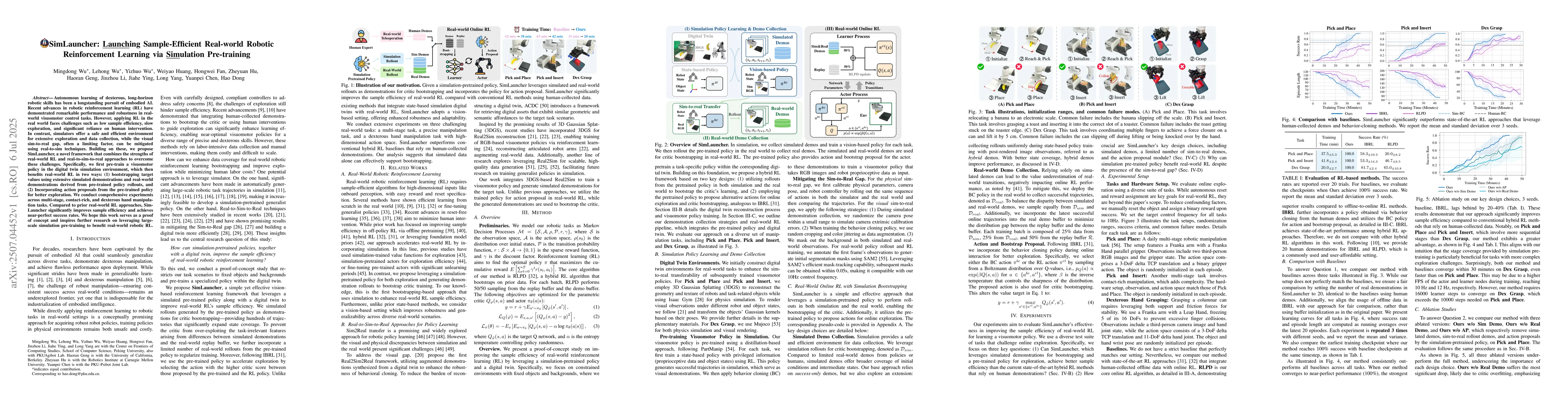 Autonomous learning of dexterous, long-horizon robotic skills has been a longstanding pursuit of embodied AI. Recent advances in robotic reinforcement learning (RL) have demonstrated remarkable performance and robustness in real-world visuomotor control tasks. However, applying RL in the real world faces challenges such as low sample efficiency, slow exploration, and significant reliance on human intervention. In contrast, simulators offer a safe and efficient environment for extensive exploration and data collection, while the visual sim-to-real gap, often a limiting factor, can be mitigated using real-to-sim techniques. Building on these, we propose SimLauncher, a novel framework that combines the strengths of real-world RL and real-to-sim-to-real approaches to overcome these challenges. Specifically, we first pre-train a visuomotor policy in the digital twin simulation environment, which then benefits real-world RL in two ways: (1) bootstrapping target values using extensive simulated demonstrations and real-world demonstrations derived from pre-trained policy rollouts, and (2) Incorporating action proposals from the pre-trained policy for better exploration. We conduct comprehensive experiments across multi-stage, contact-rich, and dexterous hand manipulation tasks. Compared to prior real-world RL approaches, SimLauncher significantly improves sample efficiency and achieves near-perfect success rates. We hope this work serves as a proof of concept and inspires further research on leveraging large-scale simulation pre-training to benefit real-world robotic RL.