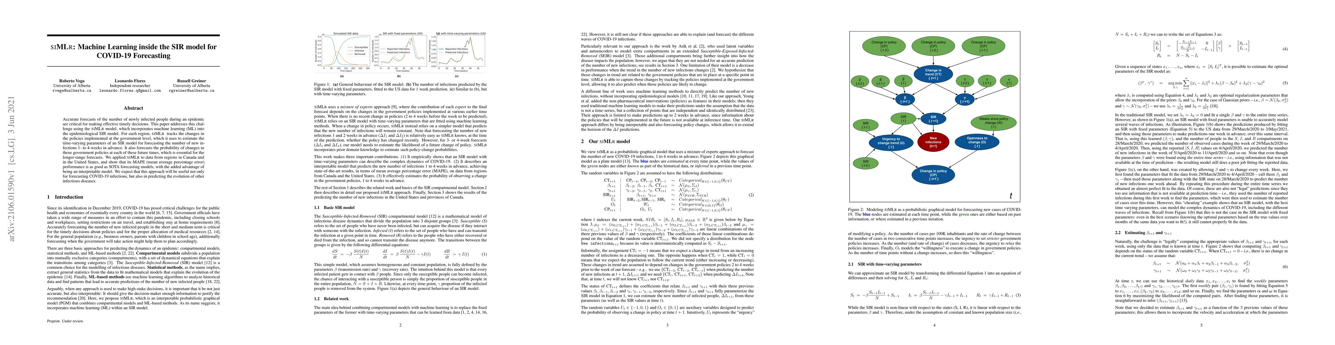 The SIMLR model integrates machine learning into the SIR model to forecast COVID-19 infections, adapting to government policy changes and achieving comparable accuracy to state-of-the-art models, while offering interpretability. This approach is shown to be effective in regions of Canada and the United States.