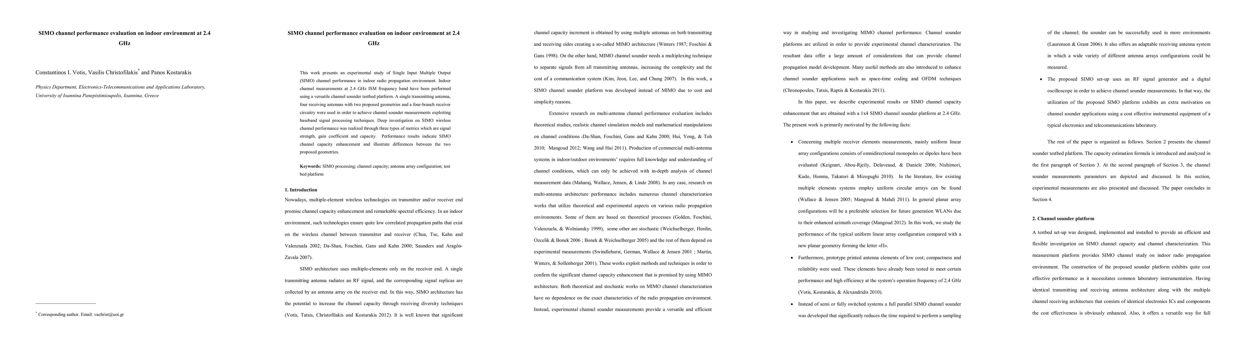 This study experimentally evaluates SIMO channel performance in indoor environments at 2.4 GHz using a channel sounder platform. Results show enhanced SIMO channel capacity and differences in performance between two proposed antenna geometries.