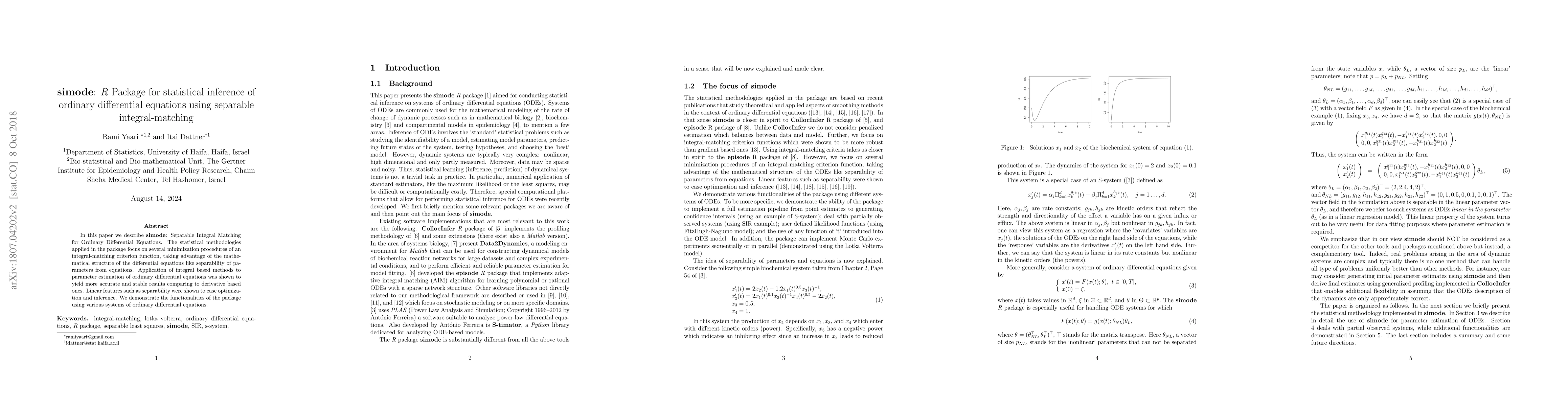 The simode R package employs separable integral-matching for statistical inference in ordinary differential equations, utilizing integral-based methods for more accurate and stable parameter estimation compared to derivative-based approaches. The package demonstrates its effectiveness through various ODE systems.