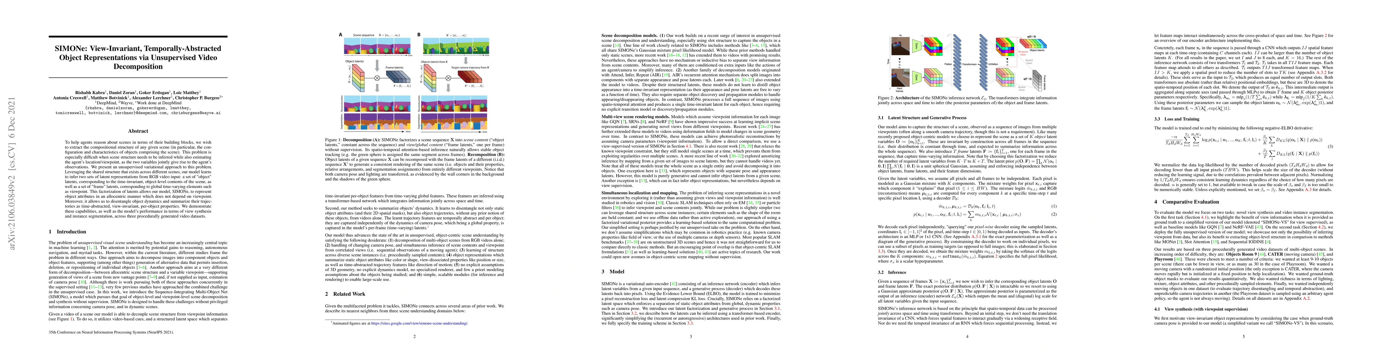 SIMONe is an unsupervised variational model that decomposes RGB video into view-invariant object representations and time-varying frame elements, enabling agents to reason about scene composition independently of viewpoint. The model demonstrates effective performance in view synthesis and instance segmentation across multiple datasets.