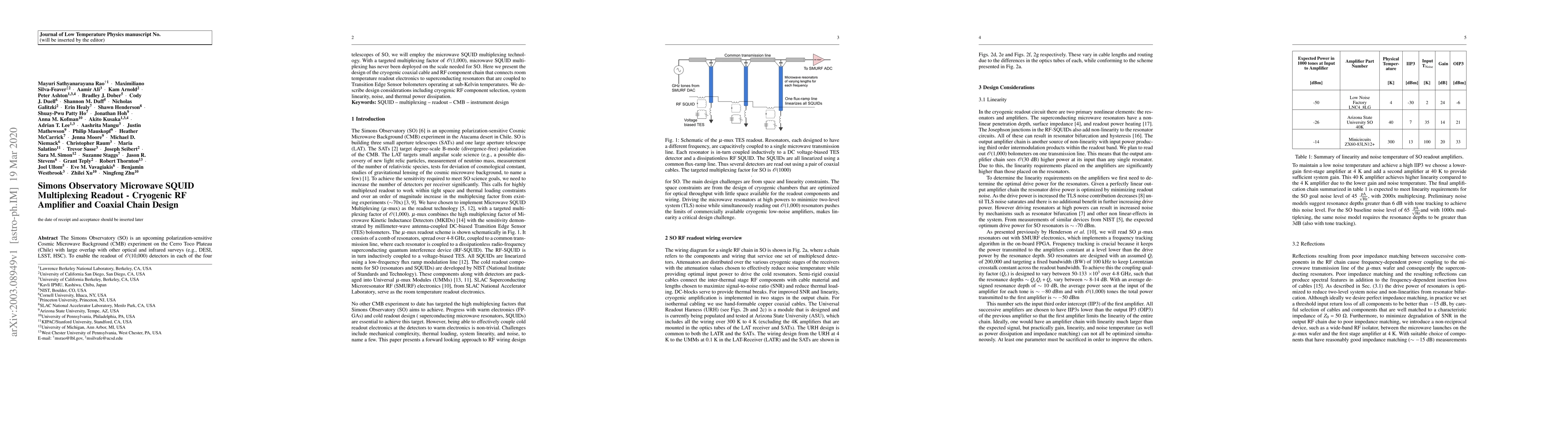 The Simons Observatory employs microwave SQUID multiplexing to read out \bigO(10,000) detectors across four telescopes, presenting a cryogenic RF amplifier and coaxial chain design to connect room temperature electronics to sub-Kelvin bolometers, addressing linearity, noise, and thermal dissipation.