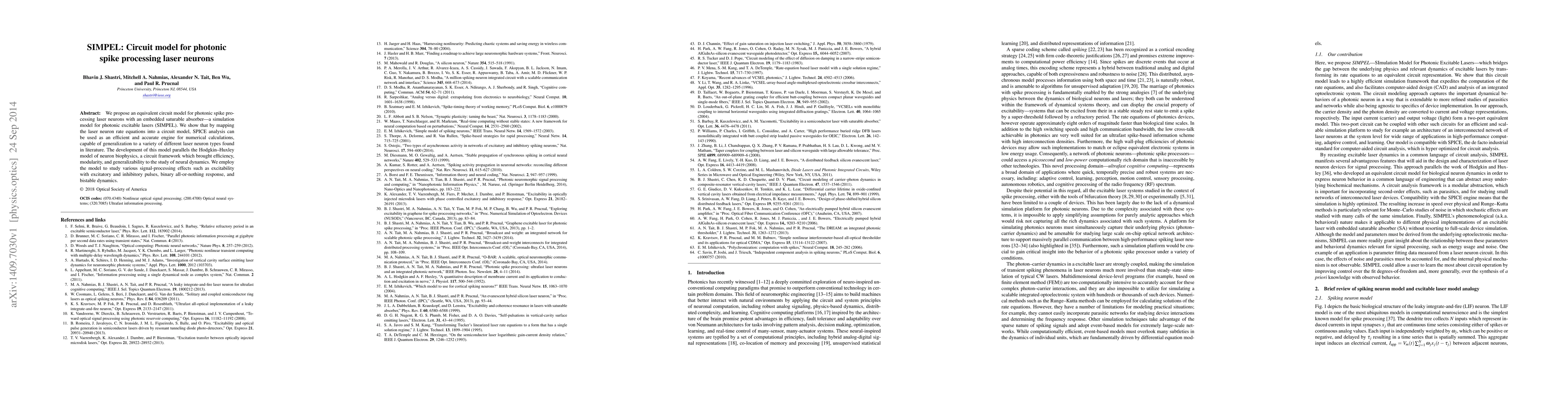 The paper introduces SIMPEL, a circuit model for photonic spike processing laser neurons, enabling efficient SPICE analysis for numerical calculations. The model parallels the Hodgkin-Huxley model for neural biophysics, and it is used to study signal-processing effects like excitability, binary responses, and bistable dynamics.