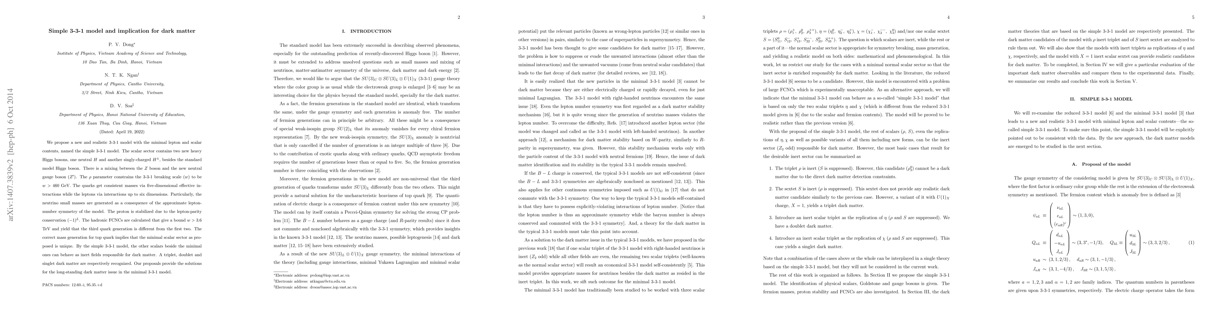 We propose a new and realistic 3-3-1 model with the minimal lepton and scalar contents, named the simple 3-3-1 model. The scalar sector contains two new heavy Higgs bosons, one neutral H and another singly-charged H^\pm, besides the standard model Higgs boson. There is a mixing between the Z boson and the new neutral gauge boson (Z'). The \rho parameter constrains the 3-3-1 breaking scale (w) to be w>460 GeV. The quarks get consistent masses via five-dimensional effective interactions while the leptons via interactions up to six dimensions. Particularly, the neutrino small masses are generated as a consequence of the approximate lepton-number symmetry of the model. The proton is stabilized due to the lepton-parity conservation (-1)^L. The hadronic FCNCs are calculated that give a bound w>3.6 TeV and yield that the third quark generation is different from the first two. The correct mass generation for top quark implies that the minimal scalar sector as proposed is unique. By the simple 3-3-1 model, the other scalars beside the minimal ones can behave as inert fields responsible for dark matter. A triplet, doublet and singlet dark matter are respectively recognized. Our proposals provide the solutions for the long-standing dark matter issue in the minimal 3-3-1 model.