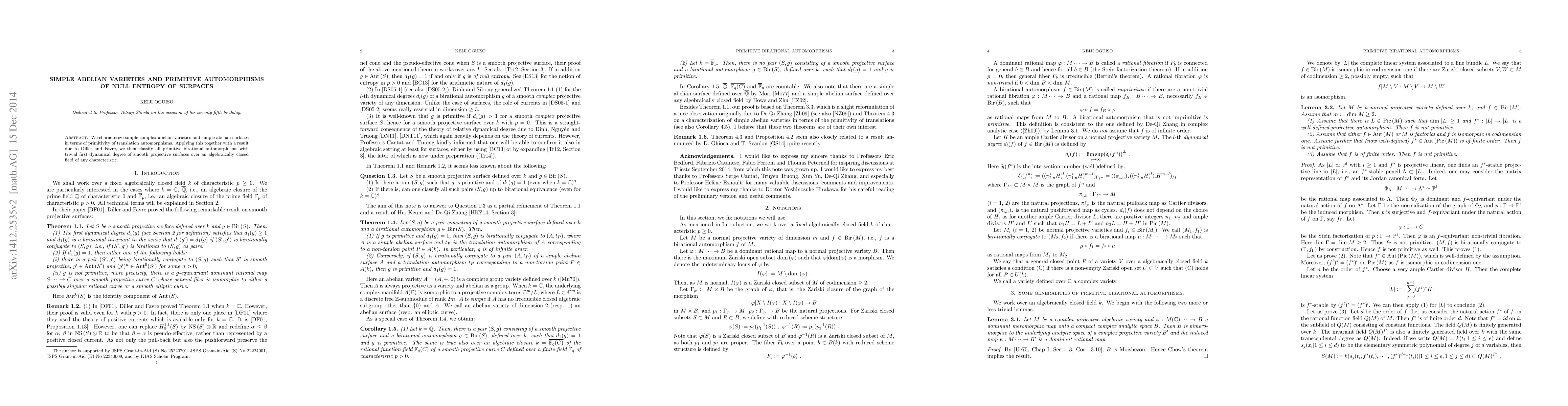 Summary: The paper characterizes simple abelian varieties and abelian surfaces based on the primitivity of their translation automorphisms and classifies primitive birational automorphisms of surfaces with null entropy using results from Diller and Favre.