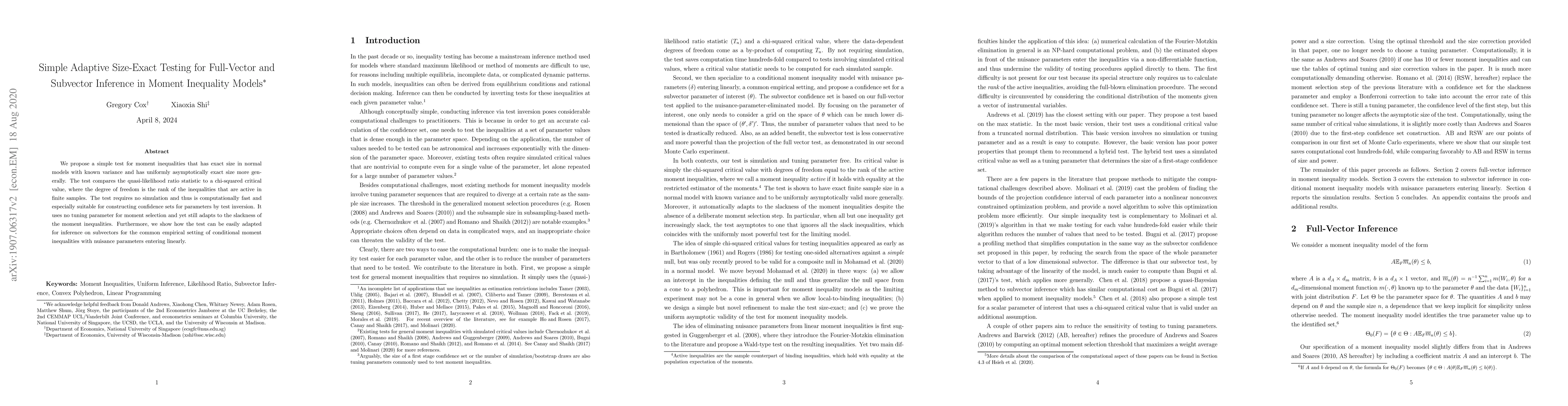 This paper introduces a computationally efficient adaptive size-exact test for moment inequalities that maintains exact size in normal models and is uniformly asymptotically exact in general. The test adapts to active inequalities without simulation or tuning parameters and can be extended for subvector inference in conditional moment inequality models.