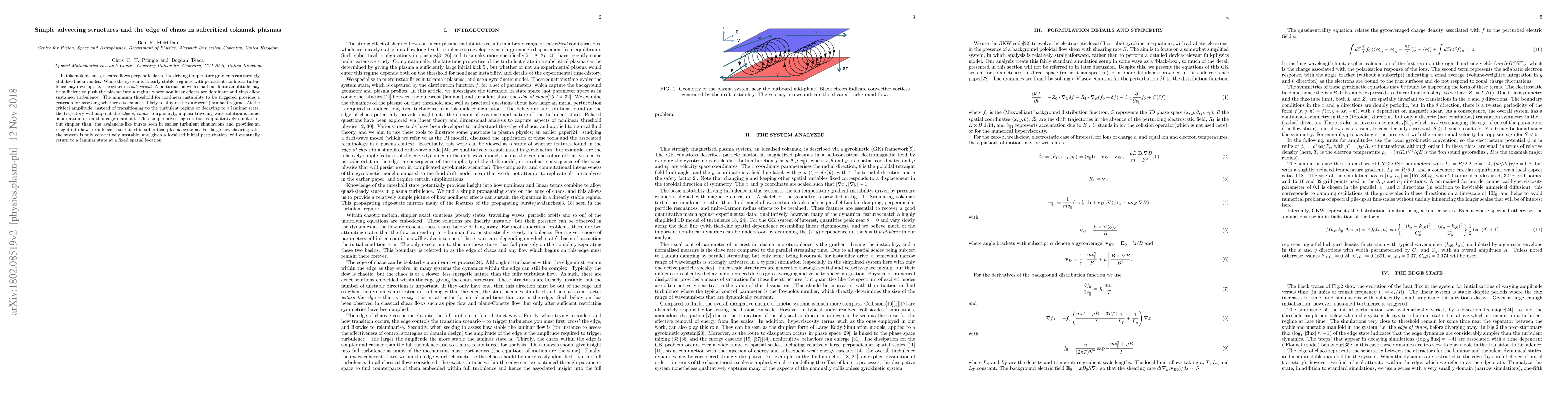 In tokamak plasmas, sheared flows perpendicular to the driving temperature gradients can strongly stabilize linear modes. While the system is linearly stable, regimes with persistent nonlinear turbulence may develop, i.e. the system is subcritical. A perturbation with small but finite amplitude may be sufficient to push the plasma into a regime where nonlinear effects are dominant and thus allow sustained turbulence. The minimum threshold for nonlinear instability to be triggered provides a criterion for assessing whether a tokamak is likely to stay in the quiescent (laminar) regime. At the critical amplitude, instead of transitioning to the turbulent regime or decaying to a laminar state, the trajectory will map out the edge of chaos. Surprisingly, a quasi-traveling-wave solution is found as an attractor on this edge manifold. This simple advecting solution is qualitatively similar to, but simpler than, the avalanche-like bursts seen in earlier turbulent simulations and provides an insight into how turbulence is sustained in subcritical plasma systems. For large flow shearing rate, the system is only convectively unstable, and given a localised initial perturbation, will eventually return to a laminar state at a fixed spatial location.