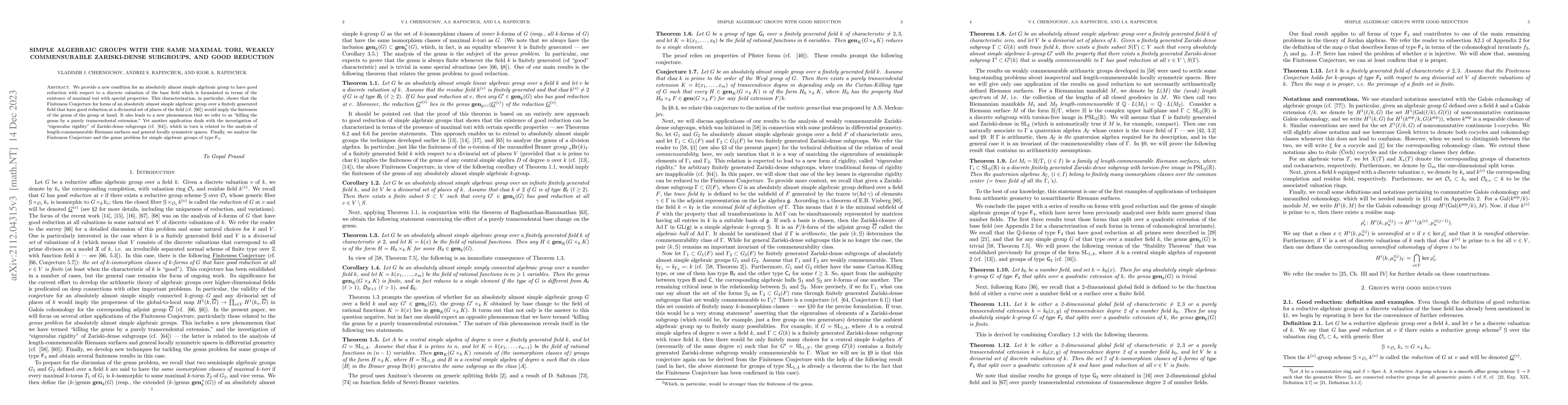 We provide a new condition for an absolutely almost simple algebraic group to have good reduction with respect to a discrete valuation of the base field which is formulated in terms of the existence of maximal tori with special properties. This characterization, in particular, shows that the Finiteness Conjecture for forms of an absolutely almost simple algebraic group over a finitely generated field that have good reduction at a divisorial set of places of the field would imply the finiteness of the genus of the group at hand. It also leads to a new phenomenon that we refer to as "killing the genus by a purely transcendental extension." Yet another application deals with the investigation of "eigenvalue rigidity" of Zariski-dense subgroups, which in turn is related to the analysis of length-commensurable Riemann surfaces and general locally symmetric spaces. Finally, we analyze the Finiteness Conjecture and the genus problem for simple algebraic groups of type $\textsf{F}_4$.