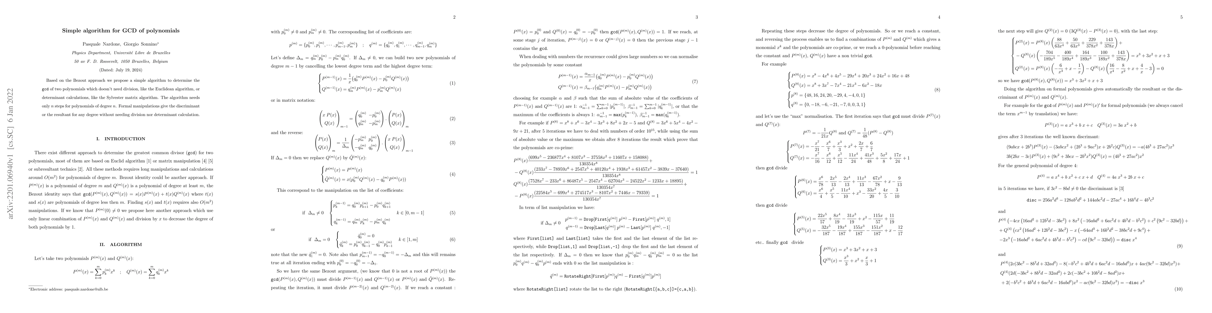 Based on the Bezout approach we propose a simple algorithm to determine the {\tt gcd} of two polynomials which doesn't need division, like the Euclidean algorithm, or determinant calculations, like the Sylvester matrix algorithm. The algorithm needs only $n$ steps for polynomials of degree $n$. Formal manipulations give the discriminant or the resultant for any degree without needing division nor determinant calculation.