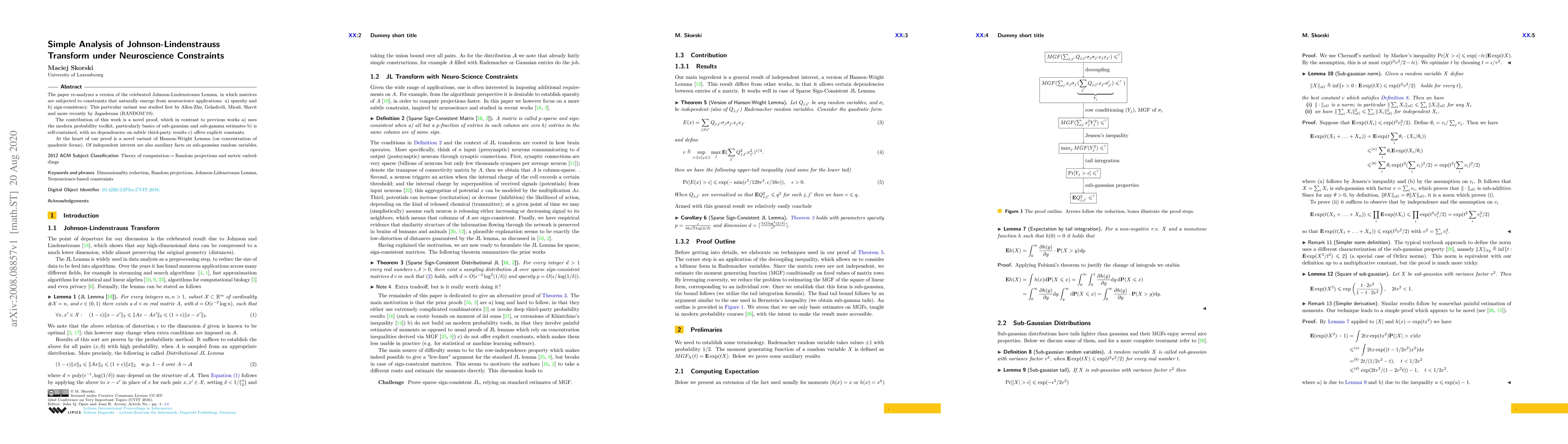 This paper presents a novel proof for a neuroscience-constrained variant of the Johnson-Lindenstrauss Lemma, utilizing modern probability tools like sub-gaussian estimates and offering explicit constants. The proof leverages a new variant of the Hanson-Wright Lemma and provides independent insights on sub-gaussian random variables.