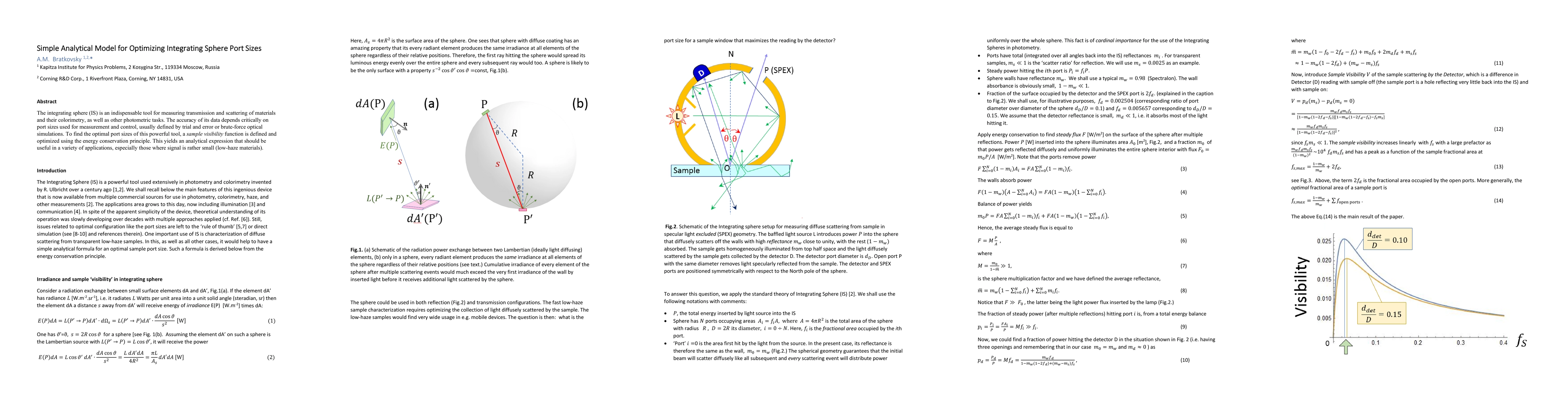 This paper presents an analytical model to optimize the port sizes of integrating spheres for accurate measurement of transmission and scattering properties, particularly for low-haze materials. The model uses a sample visibility function and energy conservation principles to derive an expression that simplifies the optimization process.