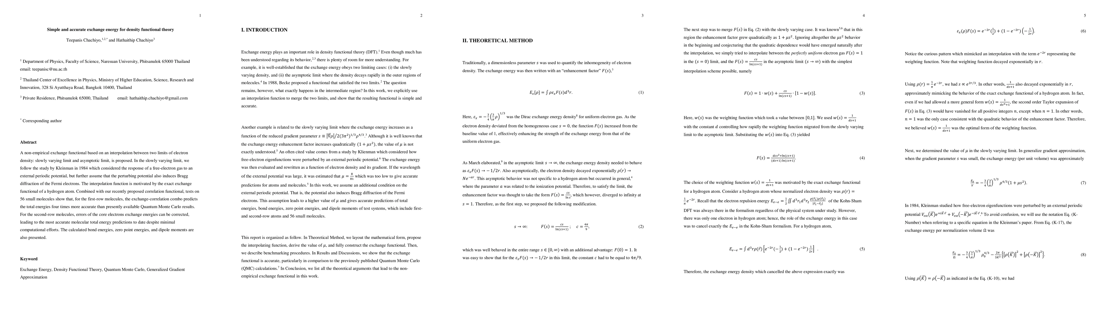 A non-empirical exchange functional based on an interpolation between two limits of electron density: slowly varying limit and asymptotic limit, is proposed. In the slowly varying limit, we follow the study by Kleinman in 1984 which considered the response of a free-electron gas to an external periodic potential, but further assume that the perturbing potential also induces Bragg diffraction of the Fermi electrons. The interpolation function is motivated by the exact exchange functional of a hydrogen atom. Combined with our recently proposed correlation functional, tests on 56 small molecules show that, for the first-row molecules, the exchange-correlation combo predicts the total energies four times more accurate than presently available Quantum Monte Carlo results. For the second-row molecules, errors of the core electrons exchange energies can be corrected, leading to the most accurate molecular total energy predictions to date despite minimal computational efforts. The calculated bond energies, zero point energies, and dipole moments are also presented.