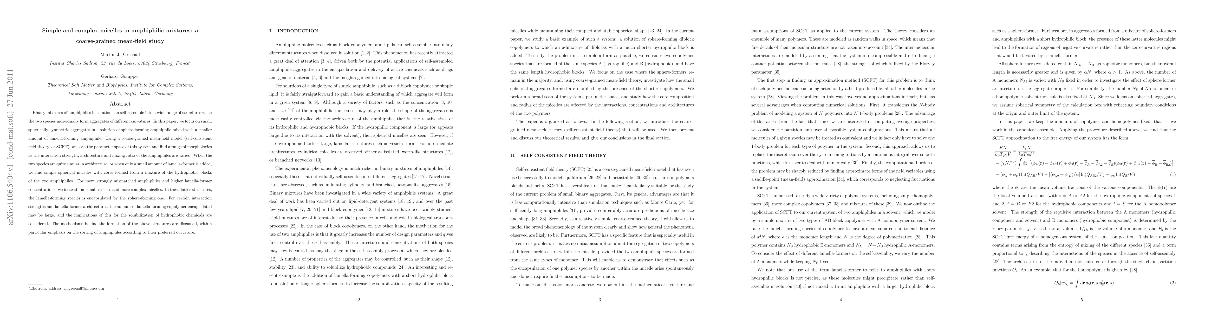 Binary mixtures of amphiphiles in solution can self-assemble into a wide range of structures when the two species individually form aggregates of different curvatures. In this paper, we focus on small, spherically-symmetric aggregates in a solution of sphere-forming amphiphile mixed with a smaller amount of lamella-forming amphiphile. Using a coarse-grained mean-field model (self-consistent field theory, or SCFT), we scan the parameter space of this system and find a range of morphologies as the interaction strength, architecture and mixing ratio of the amphiphiles are varied. When the two species are quite similar in architecture, or when only a small amount of lamella-former is added, we find simple spherical micelles with cores formed from a mixture of the hydrophobic blocks of the two amphiphiles. For more strongly mismatched amphiphiles and higher lamella-former concentrations, we instead find small vesicles and more complex micelles. In these latter structures, the lamella-forming species is encapsulated by the sphere-forming one. For certain interaction strengths and lamella-former architectures, the amount of lamella-forming copolymer encapsulated may be large, and the implications of this for the solubilization of hydrophobic chemicals are considered. The mechanisms behind the formation of the above structures are discussed, with a particular emphasis on the sorting of amphiphiles according to their preferred curvature.