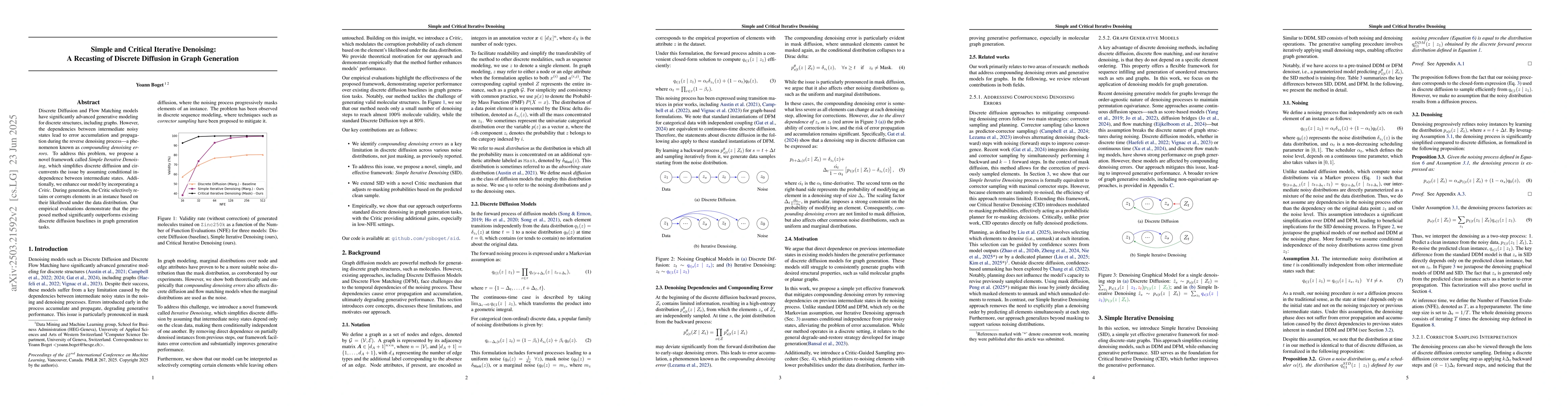 Discrete Diffusion and Flow Matching models have significantly advanced generative modeling for discrete structures, including graphs. However, the dependencies between intermediate noisy states lead to error accumulation and propagation during the reverse denoising process - a phenomenon known as compounding denoising errors. To address this problem, we propose a novel framework called Simple Iterative Denoising, which simplifies discrete diffusion and circumvents the issue by assuming conditional independence between intermediate states. Additionally, we enhance our model by incorporating a Critic. During generation, the Critic selectively retains or corrupts elements in an instance based on their likelihood under the data distribution. Our empirical evaluations demonstrate that the proposed method significantly outperforms existing discrete diffusion baselines in graph generation tasks.