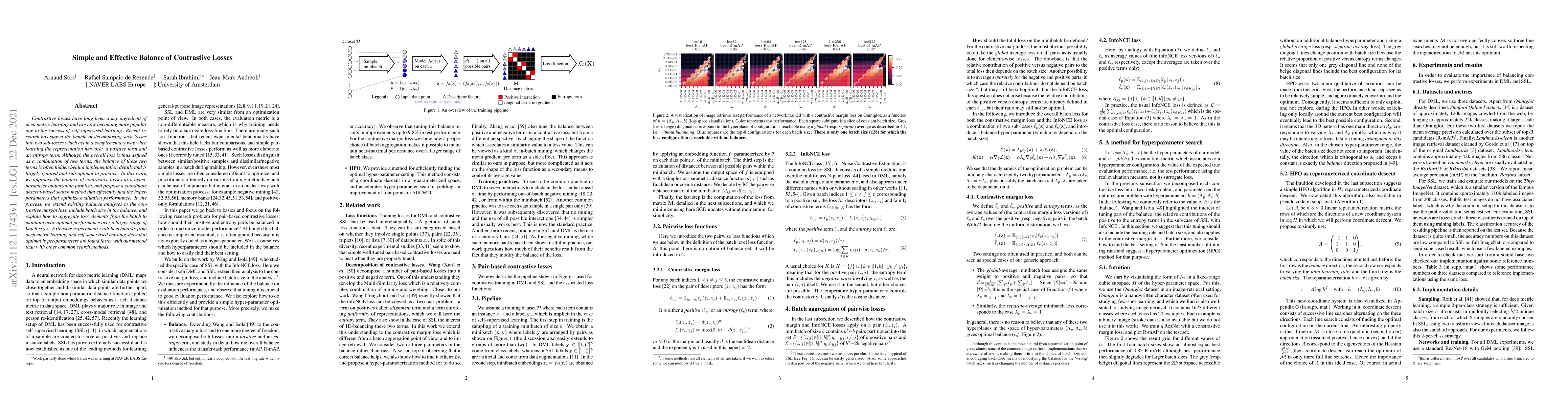 Contrastive losses have long been a key ingredient of deep metric learning and are now becoming more popular due to the success of self-supervised learning. Recent research has shown the benefit of decomposing such losses into two sub-losses which act in a complementary way when learning the representation network: a positive term and an entropy term. Although the overall loss is thus defined as a combination of two terms, the balance of these two terms is often hidden behind implementation details and is largely ignored and sub-optimal in practice. In this work, we approach the balance of contrastive losses as a hyper-parameter optimization problem, and propose a coordinate descent-based search method that efficiently find the hyper-parameters that optimize evaluation performance. In the process, we extend existing balance analyses to the contrastive margin loss, include batch size in the balance, and explain how to aggregate loss elements from the batch to maintain near-optimal performance over a larger range of batch sizes. Extensive experiments with benchmarks from deep metric learning and self-supervised learning show that optimal hyper-parameters are found faster with our method than with other common search methods.