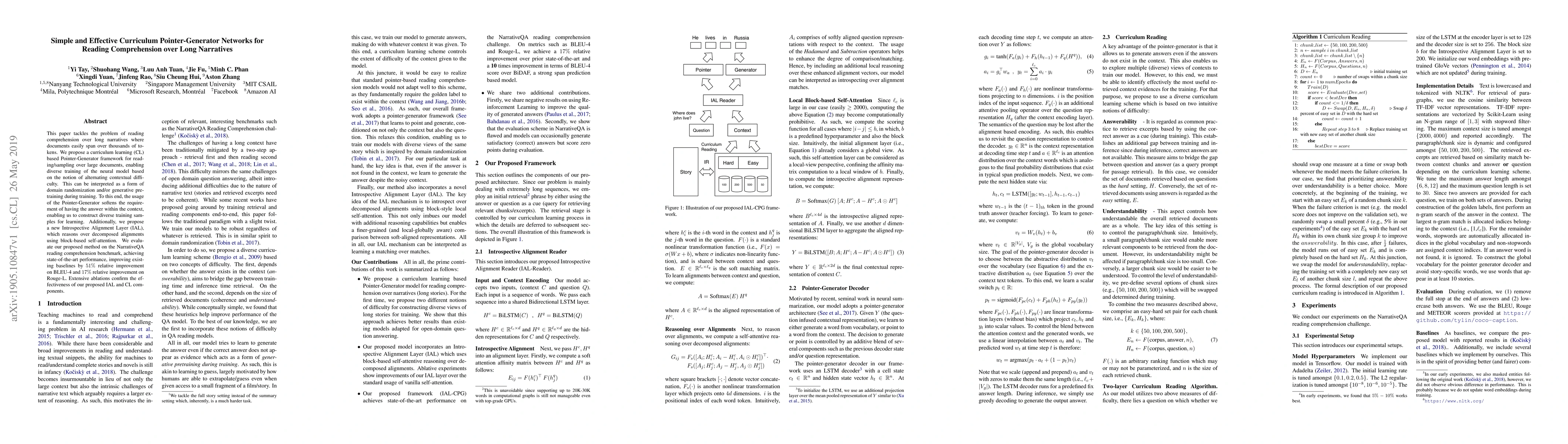 This paper tackles the problem of reading comprehension over long narratives where documents easily span over thousands of tokens. We propose a curriculum learning (CL) based Pointer-Generator framework for reading/sampling over large documents, enabling diverse training of the neural model based on the notion of alternating contextual difficulty. This can be interpreted as a form of domain randomization and/or generative pretraining during training. To this end, the usage of the Pointer-Generator softens the requirement of having the answer within the context, enabling us to construct diverse training samples for learning. Additionally, we propose a new Introspective Alignment Layer (IAL), which reasons over decomposed alignments using block-based self-attention. We evaluate our proposed method on the NarrativeQA reading comprehension benchmark, achieving state-of-the-art performance, improving existing baselines by $51\%$ relative improvement on BLEU-4 and $17\%$ relative improvement on Rouge-L. Extensive ablations confirm the effectiveness of our proposed IAL and CL components.