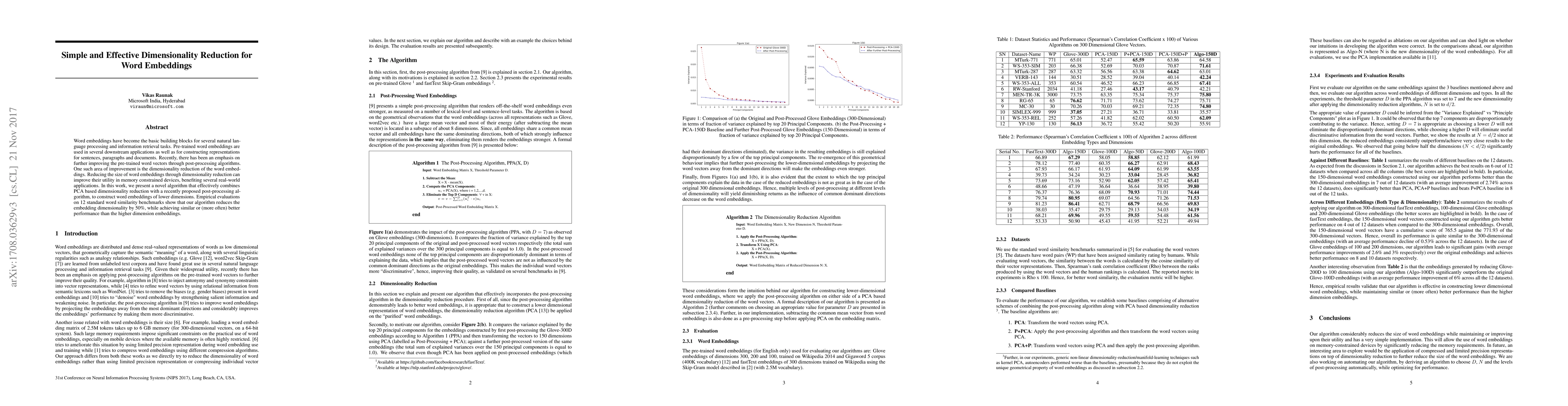This paper introduces a novel algorithm for dimensionality reduction of word embeddings, combining PCA with a post-processing method, achieving a 50% reduction in size while maintaining or improving performance on standard word similarity benchmarks.