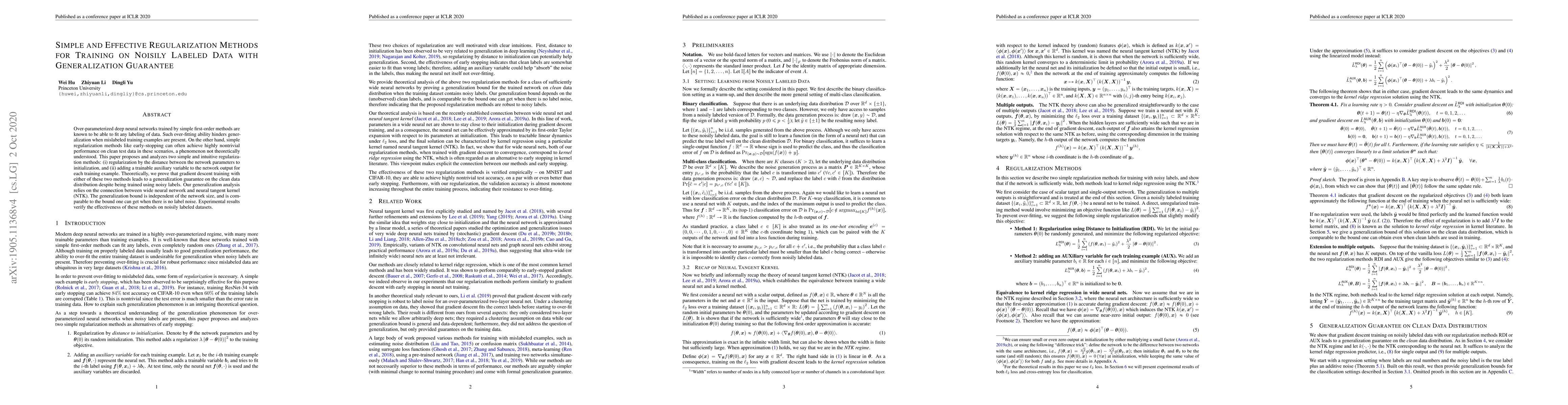 Over-parameterized deep neural networks trained by simple first-order methods are known to be able to fit any labeling of data. Such over-fitting ability hinders generalization when mislabeled training examples are present. On the other hand, simple regularization methods like early-stopping can often achieve highly nontrivial performance on clean test data in these scenarios, a phenomenon not theoretically understood. This paper proposes and analyzes two simple and intuitive regularization methods: (i) regularization by the distance between the network parameters to initialization, and (ii) adding a trainable auxiliary variable to the network output for each training example. Theoretically, we prove that gradient descent training with either of these two methods leads to a generalization guarantee on the clean data distribution despite being trained using noisy labels. Our generalization analysis relies on the connection between wide neural network and neural tangent kernel (NTK). The generalization bound is independent of the network size, and is comparable to the bound one can get when there is no label noise. Experimental results verify the effectiveness of these methods on noisily labeled datasets.