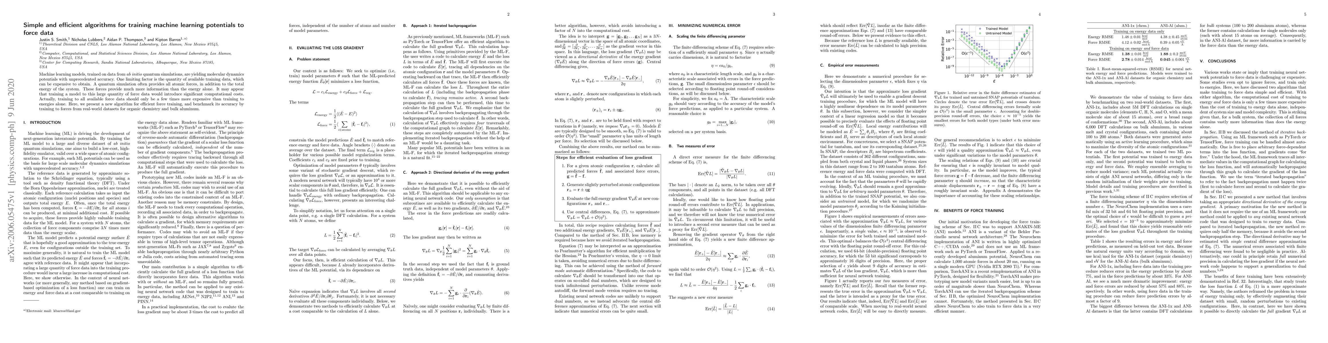 Abstract Machine learning models, trained on data from ab initio quantum simulations, are yielding molecular dynamics potentials with unprecedented accuracy. One limiting factor is the quantity of available training data, which can be expensive to obtain. A quantum simulation often provides all atomic forces, in addition to the total energy of the system. These forces provide much more information than the energy alone. It may appear that training a model to this large quantity of force data would introduce significant computational costs. Actually, training to all available force data should only be a few times more expensive than training to energies alone. Here, we present a new algorithm for efficient force training, and benchmark its accuracy by training to forces from real-world datasets for organic chemistry and bulk aluminum.