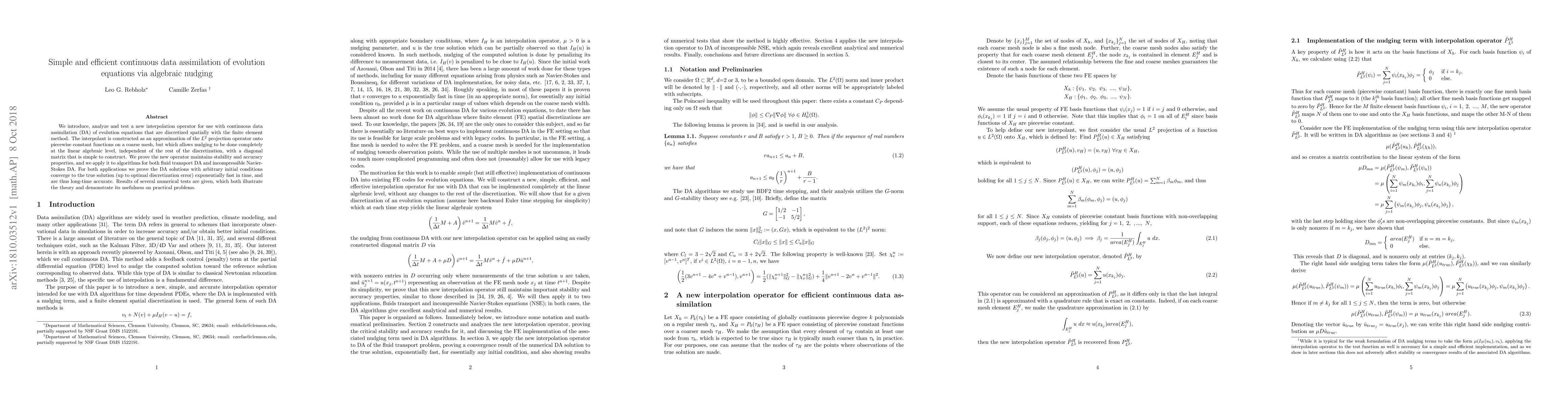 We introduce, analyze and test a new interpolation operator for use with continuous data assimilation (DA) of evolution equations that are discretized spatially with the finite element method. The interpolant is constructed as an approximation of the L2 projection operator onto piecewise constant functions on a coarse mesh, but which allows nudging to be done completely at the linear algebraic level, independent of the rest of the discretization, with a diagonal matrix that is simple to construct. We prove the new operator maintains stability and accuracy properties, and we apply it to algorithms for both fluid transport DA and incompressible Navier Stokes DA. For both applications we prove the DA solutions with arbitrary initial conditions converge to the true solution (up to optimal discretization error) exponentially fast in time, and are thus long-time accurate. Results of several numerical tests are given, which both illustrate the theory and demonstrate its usefulness on practical problems.