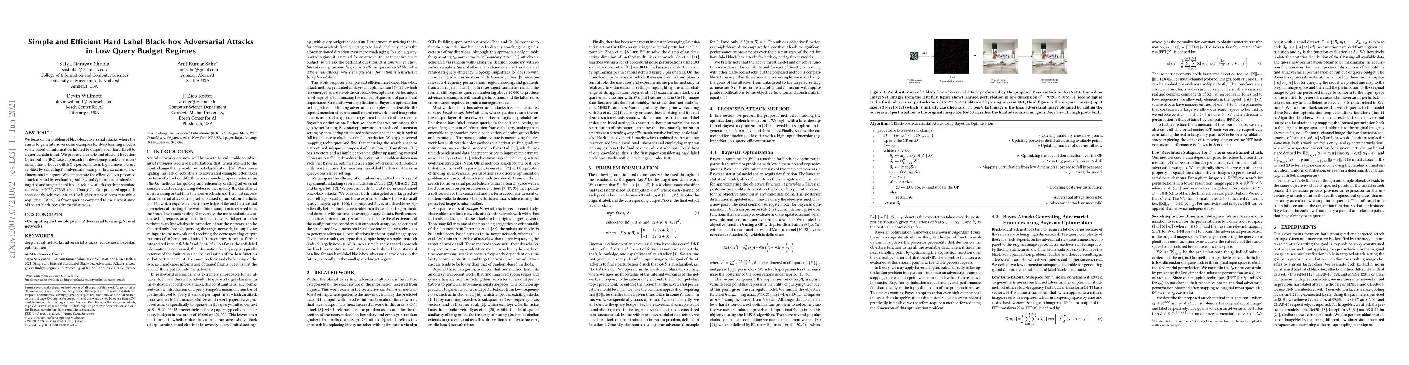 This paper proposes a Bayesian Optimization-based method for efficient black-box adversarial attacks with limited query budget, focusing on generating adversarial examples using only output labels. The approach achieves significantly higher attack success rates and requires fewer queries compared to existing methods.