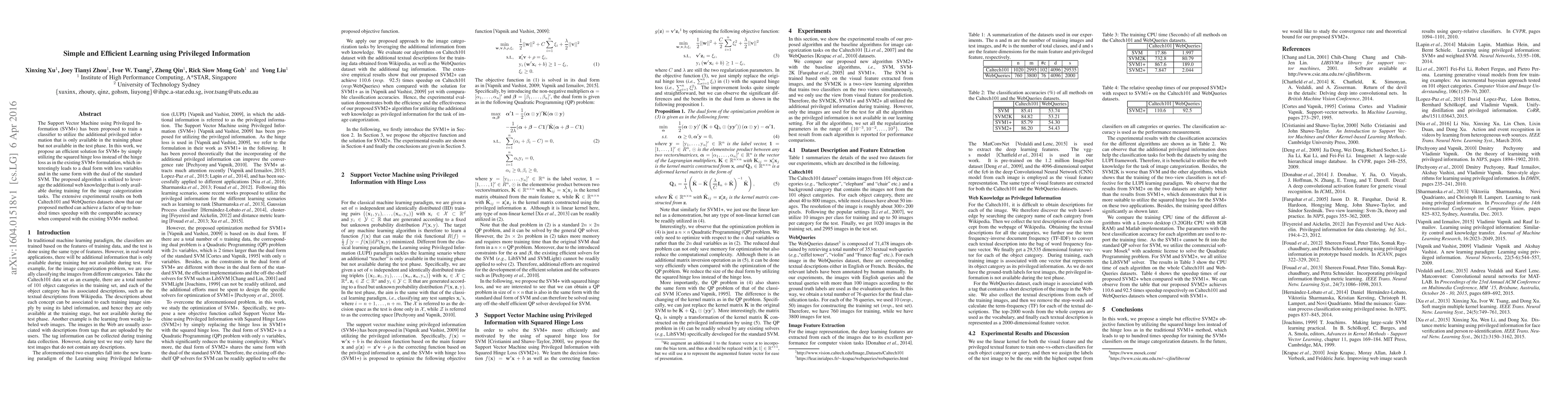 The Support Vector Machine using Privileged Information (SVM+) has been proposed to train a classifier to utilize the additional privileged information that is only available in the training phase but not available in the test phase. In this work, we propose an efficient solution for SVM+ by simply utilizing the squared hinge loss instead of the hinge loss as in the existing SVM+ formulation, which interestingly leads to a dual form with less variables and in the same form with the dual of the standard SVM. The proposed algorithm is utilized to leverage the additional web knowledge that is only available during training for the image categorization tasks. The extensive experimental results on both Caltech101 andWebQueries datasets show that our proposed method can achieve a factor of up to hundred times speedup with the comparable accuracy when compared with the existing SVM+ method.