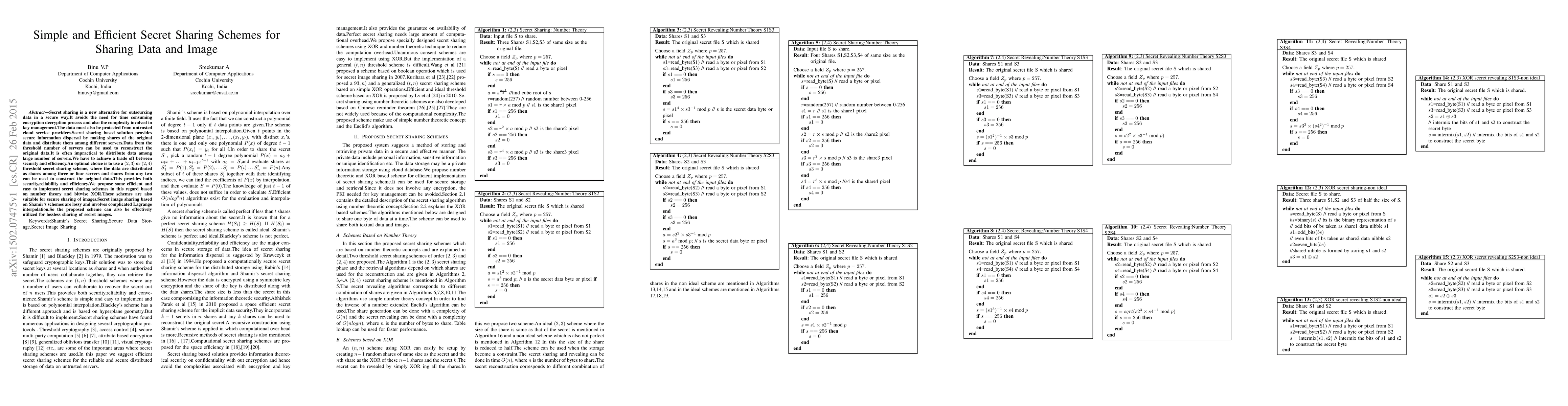Secret sharing is a new alternative for outsourcing data in a secure way.It avoids the need for time consuming encryption decryption process and also the complexity involved in key management.The data must also be protected from untrusted cloud service providers.Secret sharing based solution provides secure information dispersal by making shares of the original data and distribute them among different servers.Data from the threshold number of servers can be used to reconstruct the original data.It is often impractical to distribute data among large number of servers.We have to achieve a trade off between security and efficiency.An optimal choice is to use a $(2,3)$ or $(2,4)$ threshold secret sharing scheme, where the data are distributed as shares among three or four servers and shares from any two can be used to construct the original data.This provides both security,reliability and efficiency.We propose some efficient and easy to implement secret sharing schemes in this regard based on number theory and bitwise XOR.These schemes are also suitable for secure sharing of images.Secret image sharing based on Shamir's schemes are lossy and involves complicated Lagrange interpolation.So the proposed scheme can also be effectively utilized for lossless sharing of secret images.