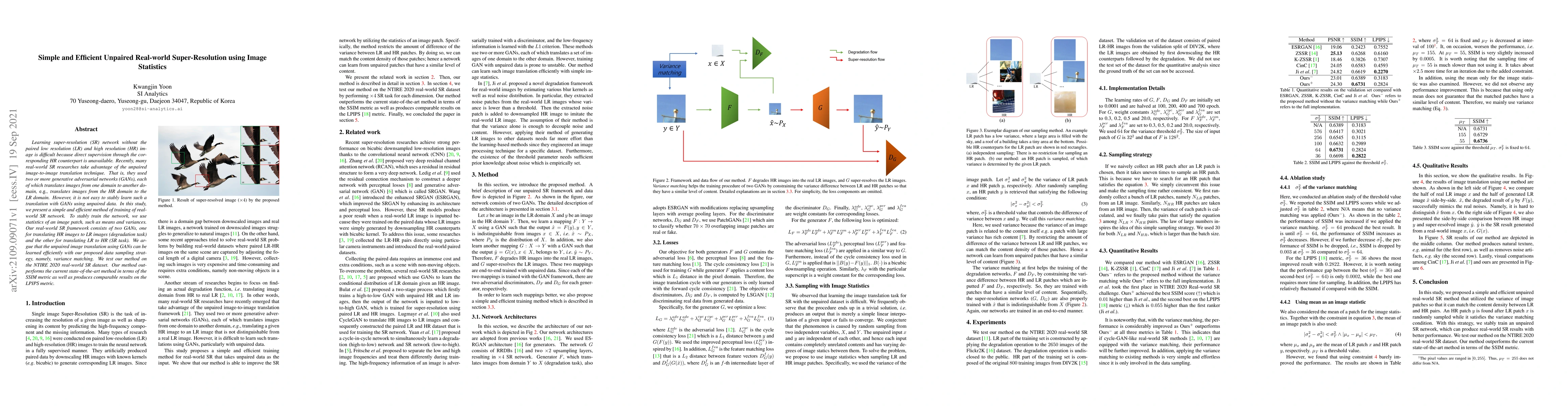 Learning super-resolution (SR) network without the paired low resolution (LR) and high resolution (HR) image is difficult because direct supervision through the corresponding HR counterpart is unavailable. Recently, many real-world SR researches take advantage of the unpaired image-to-image translation technique. That is, they used two or more generative adversarial networks (GANs), each of which translates images from one domain to another domain, \eg, translates images from the HR domain to the LR domain. However, it is not easy to stably learn such a translation with GANs using unpaired data. In this study, we present a simple and efficient method of training of real-world SR network. To stably train the network, we use statistics of an image patch, such as means and variances. Our real-world SR framework consists of two GANs, one for translating HR images to LR images (degradation task) and the other for translating LR to HR (SR task). We argue that the unpaired image translation using GANs can be learned efficiently with our proposed data sampling strategy, namely, variance matching. We test our method on the NTIRE 2020 real-world SR dataset. Our method outperforms the current state-of-the-art method in terms of the SSIM metric as well as produces comparable results on the LPIPS metric.