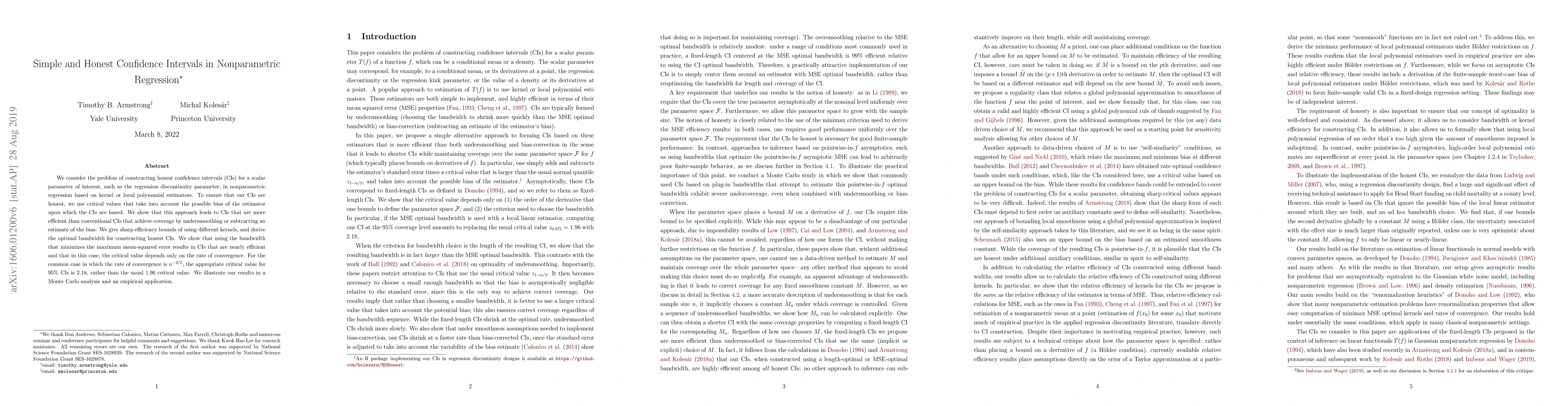 This paper develops honest confidence intervals for scalar parameters in nonparametric regression, using critical values that account for estimator bias. It shows that these intervals are more efficient than conventional methods, providing optimal bandwidths and demonstrating improved efficiency through Monte Carlo analysis and empirical application.