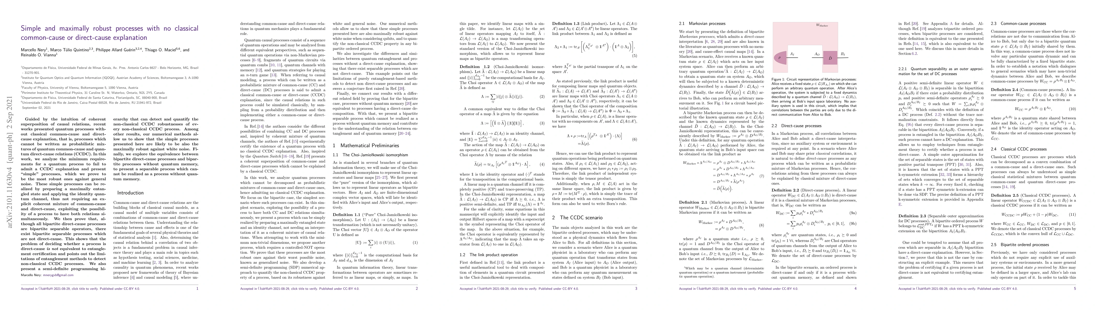 Guided by the intuition of coherent superposition of causal relations, recent works presented quantum processes without classical common-cause and direct-cause explanation, that is, processes which cannot be written as probabilistic mixtures of quantum common-cause and quantum direct-cause relations (CCDC). In this work, we analyze the minimum requirements for a quantum process to fail to admit a CCDC explanation and present "simple" processes, which we prove to be the most robust ones against general noise. These simple processes can be realized by preparing a maximally entangled state and applying the identity quantum channel, thus not requiring an explicit coherent mixture of common-cause and direct-cause, exploiting the possibility of a process to have both relations simultaneously. We then prove that, although all bipartite direct-cause processes are bipartite separable operators, there exist bipartite separable processes which are not direct-cause. This shows that the problem of deciding weather a process is direct-cause process is not equivalent to entanglement certification and points out the limitations of entanglement methods to detect non-classical CCDC processes. We also present a semi-definite programming hierarchy that can detect and quantify the non-classical CCDC robustnesses of every non-classical CCDC process. Among other results, our numerical methods allow us to show that the simple processes presented here are likely to be also the maximally robust against white noise. Finally, we explore the equivalence between bipartite direct-cause processes and bipartite processes without quantum memory, to present a separable process which cannot be realized as a process without quantum memory.