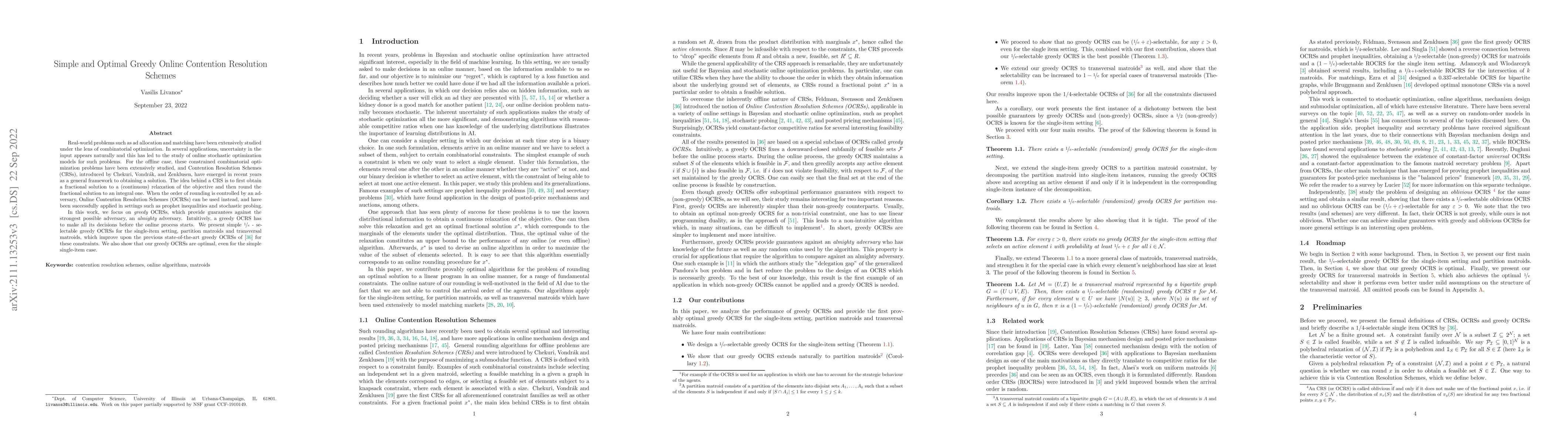 This paper introduces simple and optimal greedy Online Contention Resolution Schemes (OCRSs) for combinatorial optimization problems under uncertainty. The authors present $1/e$ - selectable greedy OCRSs for single-item settings, partition matroids, and transversal matroids, improving upon previous state-of-the-art methods and proving their optimality.