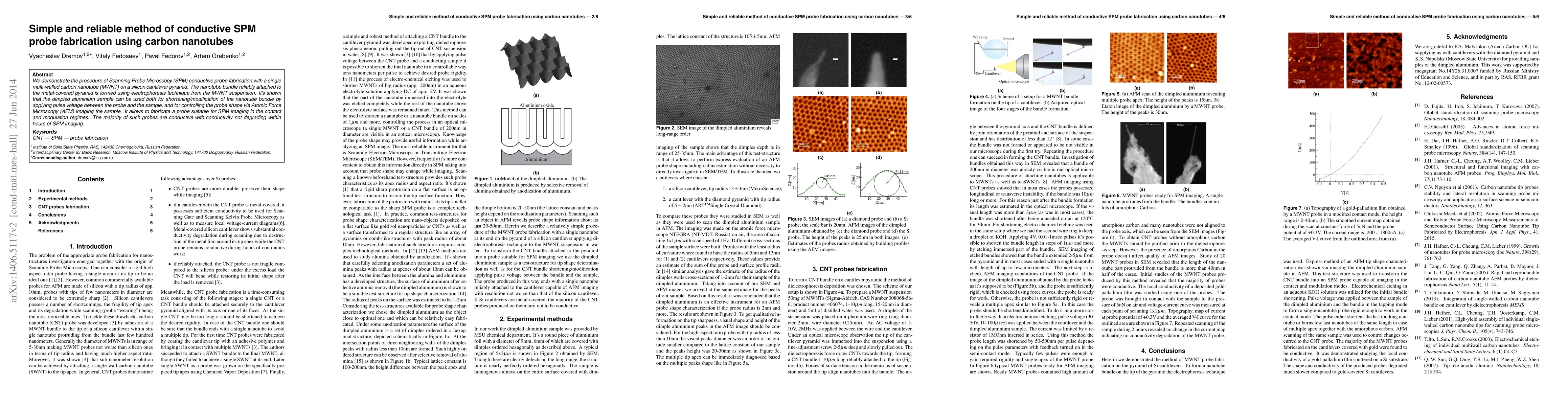 We demonstrate the procedure of Scanning Probe Microscopy (SPM) conductive probe fabrication with a single multi-walled carbon nanotube (MWNT) on a silicon cantilever pyramid. The nanotube bundle reliably attached to the metal-covered pyramid is formed using electrophoresis technique from the MWNT suspension. It is shown that the dimpled aluminium sample can be used both for shortening/modification of the nanotube bundle by applying pulse voltage between the probe and the sample, and for controlling the probe shape via Atomic Force Microscopy (AFM) imaging the sample. It allows to fabricate a probe suitable for SPM imaging in the contact and modulation regimes. The majority of such probes are conductive with conductivity not degrading within hours of SPM imaging.