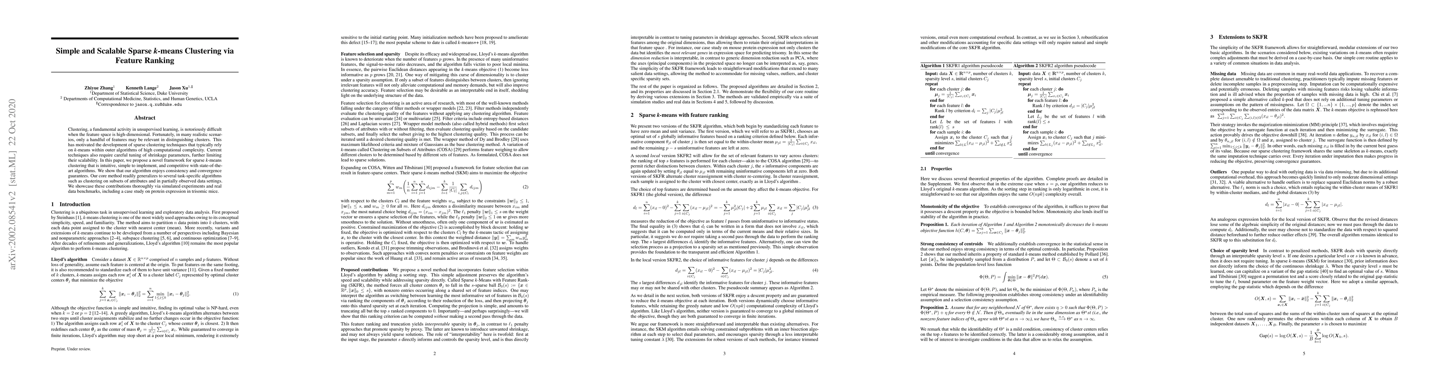 This paper proposes a simple and scalable sparse k-means clustering method using feature ranking, offering consistency and convergence guarantees. The method is shown to be competitive with state-of-the-art techniques and effectively handles high-dimensional data with minimal relevant features.