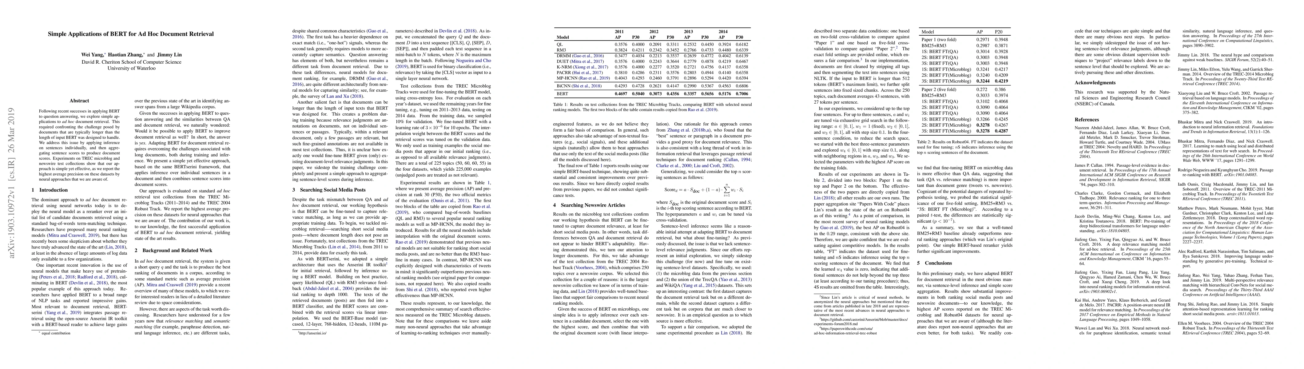 Following recent successes in applying BERT to question answering, we explore simple applications to ad hoc document retrieval. This required confronting the challenge posed by documents that are typically longer than the length of input BERT was designed to handle. We address this issue by applying inference on sentences individually, and then aggregating sentence scores to produce document scores. Experiments on TREC microblog and newswire test collections show that our approach is simple yet effective, as we report the highest average precision on these datasets by neural approaches that we are aware of.