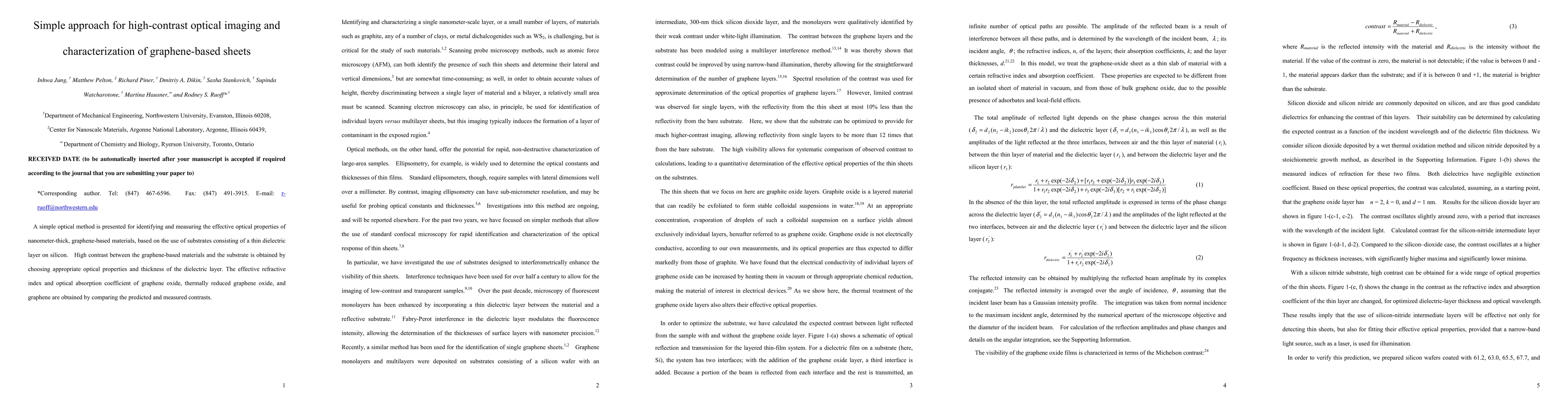 A simple optical method is presented for identifying and measuring the effective optical properties of nanometer-thick, graphene-based materials, based on the use of substrates consisting of a thin dielectric layer on silicon. High contrast between the graphene-based materials and the substrate is obtained by choosing appropriate optical properties and thickness of the dielectric layer. The effective refractive index and optical absorption coefficient of graphene oxide, thermally reduced graphene oxide, and graphene are obtained by comparing the predicted and measured contrasts.