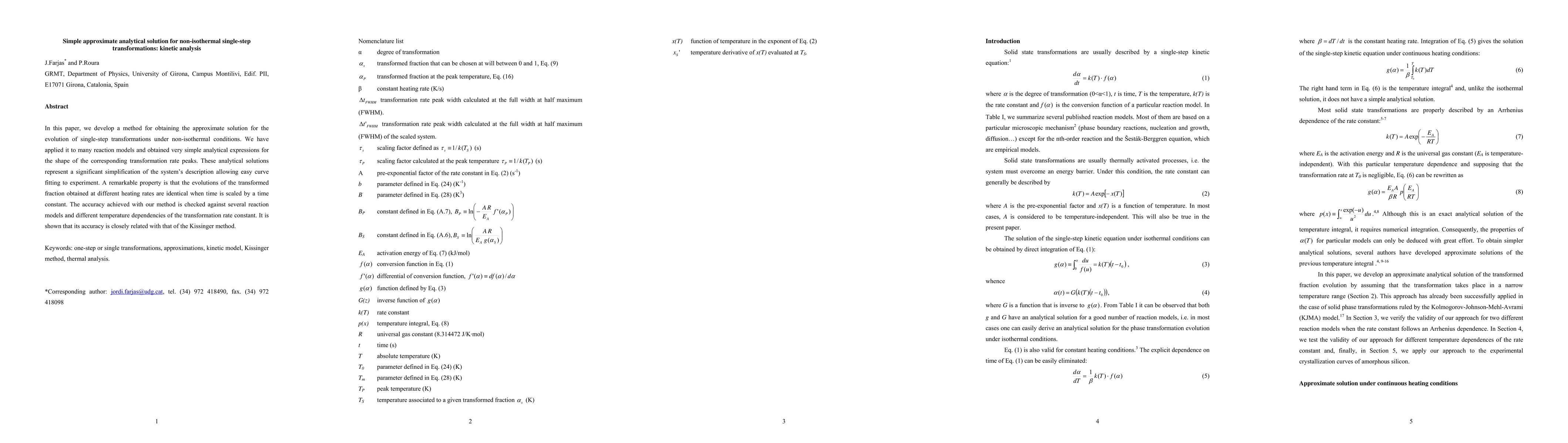 In this paper, we develop a method for obtaining the approximate solution for the evolution of single-step transformations under non-isothermal conditions. We have applied it to many reaction models and obtained very simple analytical expressions for the shape of the corresponding transformation rate peaks. These analytical solutions represent a significant simplification of the system's description allowing easy curve fitting to experiment. A remarkable property is that the evolutions of the transformed fraction obtained at different heating rates are identical when time is scaled by a time constant. The accuracy achieved with our method is checked against several reaction models and different temperature dependencies of the transformation rate constant. It is shown that its accuracy is closely related with that of the Kissinger method.