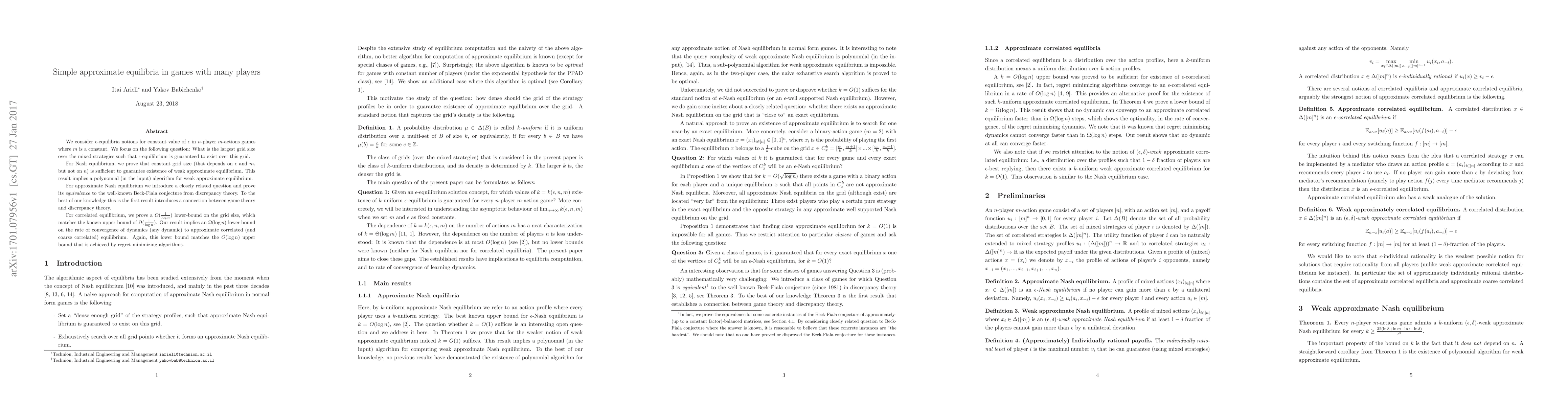 We consider $\epsilon$-equilibria notions for constant value of $\epsilon$ in $n$-player $m$-actions games where $m$ is a constant. We focus on the following question: What is the largest grid size over the mixed strategies such that $\epsilon$-equilibrium is guaranteed to exist over this grid. For Nash equilibrium, we prove that constant grid size (that depends on $\epsilon$ and $m$, but not on $n$) is sufficient to guarantee existence of weak approximate equilibrium. This result implies a polynomial (in the input) algorithm for weak approximate equilibrium. For approximate Nash equilibrium we introduce a closely related question and prove its \emph{equivalence} to the well-known Beck-Fiala conjecture from discrepancy theory. To the best of our knowledge this is the first result introduces a connection between game theory and discrepancy theory. For correlated equilibrium, we prove a $O(\frac{1}{\log n})$ lower-bound on the grid size, which matches the known upper bound of $\Omega(\frac{1}{\log n})$. Our result implies an $\Omega(\log n)$ lower bound on the rate of convergence of dynamics (any dynamic) to approximate correlated (and coarse correlated) equilibrium. Again, this lower bound matches the $O(\log n)$ upper bound that is achieved by regret minimizing algorithms.