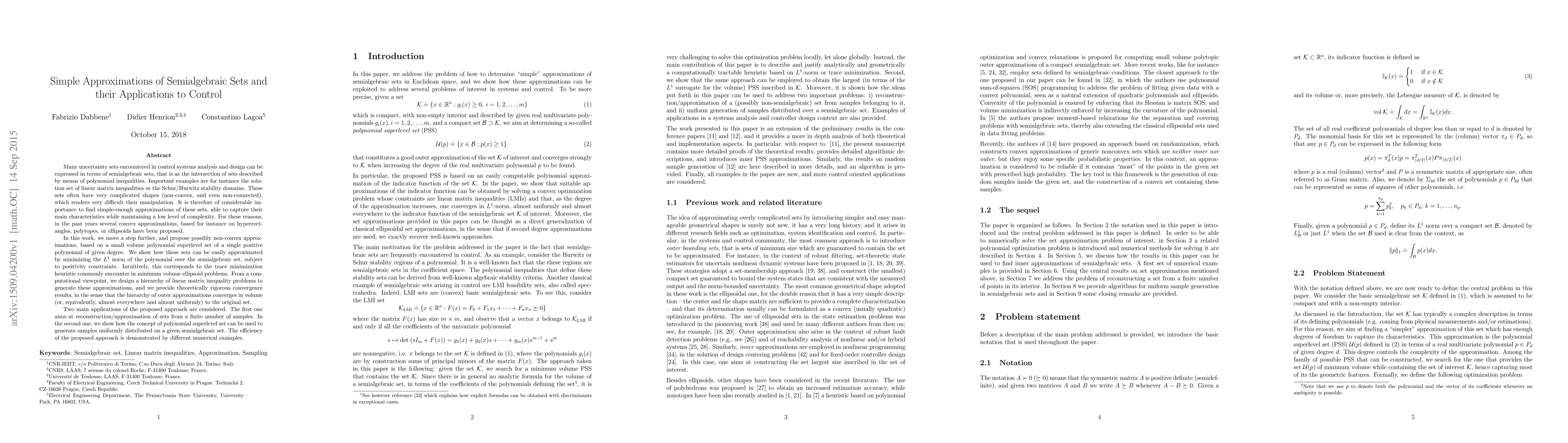 Many uncertainty sets encountered in control systems analysis and design can be expressed in terms of semialgebraic sets, that is as the intersection of sets described by means of polynomial inequalities. Important examples are for instance the solution set of linear matrix inequalities or the Schur/Hurwitz stability domains. These sets often have very complicated shapes (non-convex, and even non-connected), which renders very difficult their manipulation. It is therefore of considerable importance to find simple-enough approximations of these sets, able to capture their main characteristics while maintaining a low level of complexity. For these reasons, in the past years several convex approximations, based for instance on hyperrect-angles, polytopes, or ellipsoids have been proposed. In this work, we move a step further, and propose possibly non-convex approximations , based on a small volume polynomial superlevel set of a single positive polynomial of given degree. We show how these sets can be easily approximated by minimizing the L1 norm of the polynomial over the semialgebraic set, subject to positivity constraints. Intuitively, this corresponds to the trace minimization heuristic commonly encounter in minimum volume ellipsoid problems. From a computational viewpoint, we design a hierarchy of linear matrix inequality problems to generate these approximations, and we provide theoretically rigorous convergence results, in the sense that the hierarchy of outer approximations converges in volume (or, equivalently, almost everywhere and almost uniformly) to the original set. Two main applications of the proposed approach are considered. The first one aims at reconstruction/approximation of sets from a finite number of samples. In the second one, we show how the concept of polynomial superlevel set can be used to generate samples uniformly distributed on a given semialgebraic set. The efficiency of the proposed approach is demonstrated by different numerical examples.