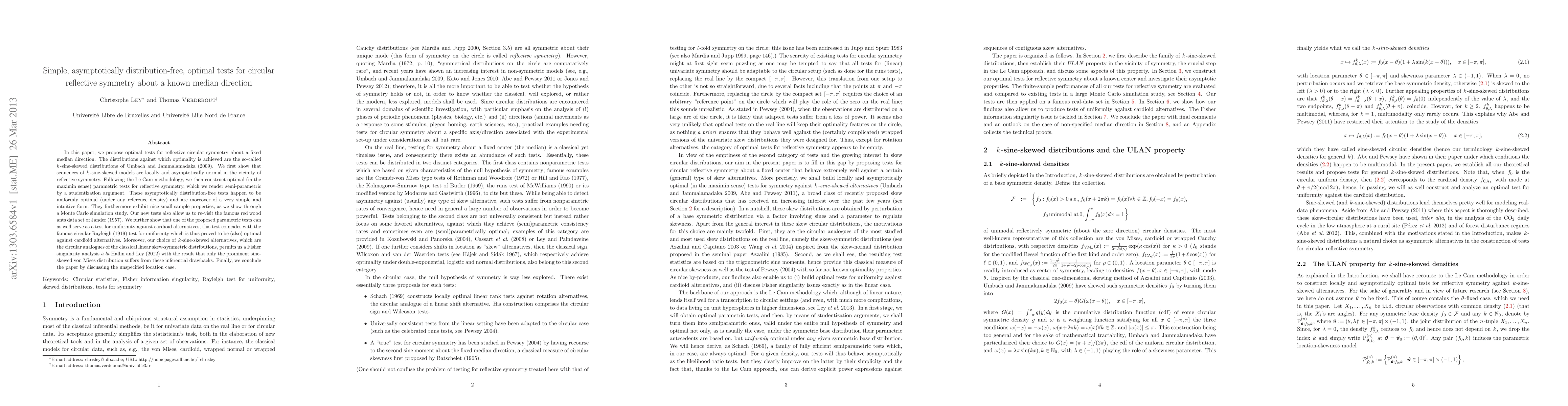 Researchers propose simple, asymptotically distribution-free tests for circular reflective symmetry about a known median direction, demonstrating they are uniformly optimal against any reference density.
